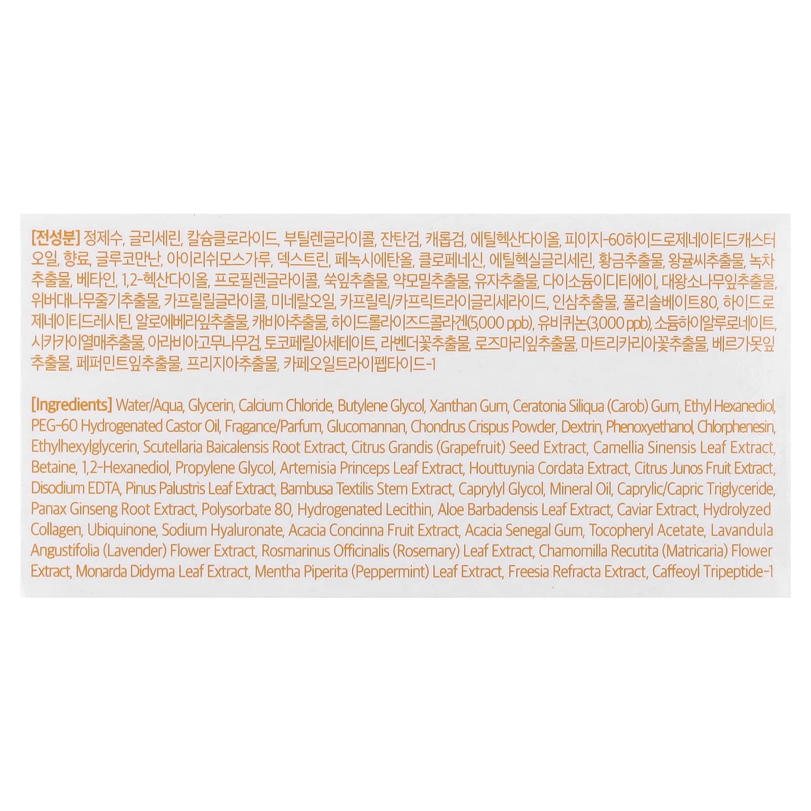 Вода, глицерин, хлорид кальция, бутиленгликоль, ксантановая камедь, камедь рожкового дерева (Ceratonia siliqua), этил гександиол, ПЭГ-60 гидрогенизированное касторовое масло, отдушка, глюкоманнан, порошок из ирландского мха (Chondrus crispus), декстрин, феноксиэтанол, хлорфенезин, этилгексилглицерин, экстракт корня шлемника (Scutellaria baicalensis), экстракт семян грейпфрута (Citrus grandis), экстракт листьев зелёного чая (Camellia sinensis), бетаин, 1,2-гександиол, пропиленгликоль, экстракт листьев полыни корейской (Artemisia princeps), экстракт хауттюйнии (Houttuynia cordata), экстракт плодов юдзу (Citrus junos), двунатриевая ЭДТК, экстракт хвои сосны болотной (Pinus palustris), экстракт стеблей бамбука (Bambusa textilis), каприлилгликоль, минеральное масло, каприловый/каприновый триглицерид, экстракт корня женьшеня (Panax ginseng), полисорбат 80, гидрогенизированный лецитин, экстракт листьев алоэ вера (Aloe barbadensis), экстракт черной икры, гидролизованный коллаген, убихинон, гиалуронат натрия, экстракт плодов акации концинной (Acacia concinna), смола сенегальской акации (Acacia senegal), токоферилацетат, экстракт цветков лаванды (Lavandula angustifolia), экстракт листьев розмарина (Rosmarinus officinalis), экстракт цветков ромашки лекарственной (Chamomilla recutita), экстракт листьев монарды двойчатой (Monarda didyma), экстракт листьев перечной мяты (Mentha piperita), экстракт фрезии (Feesia refracta), кофеоил трипептид-1.