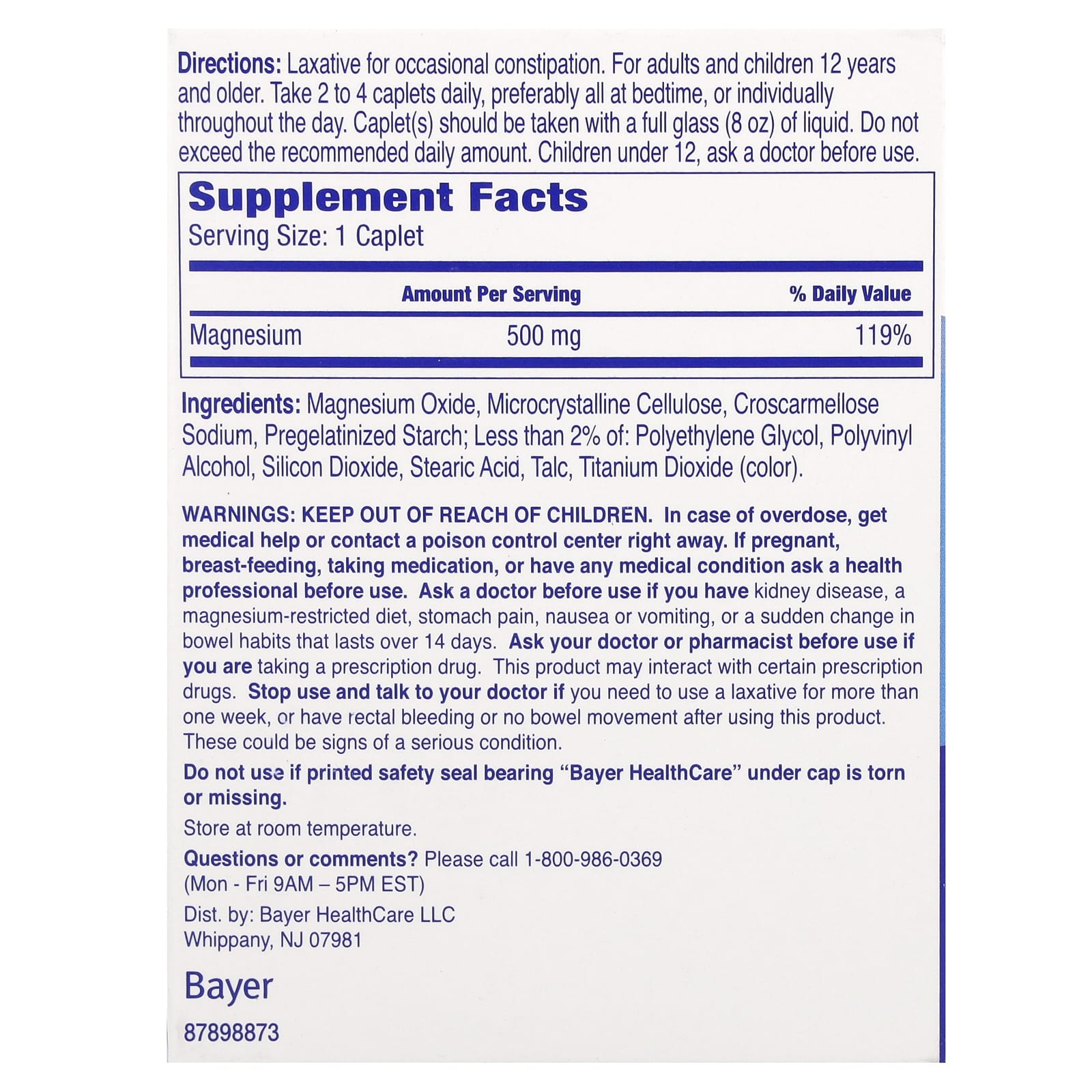 Хранитьв недоступном для детей месте. В случае передозировки обратитесь за медицинской помощью или немедленно свяжитесь с токсикологическим центром. Перед применением во время беременности или кормления грудью, приема медицинских препаратов, а также при наличии каких-либо заболеваний следует проконсультироваться с медицинским работником. Необходимо проконсультироваться с врачом перед использованием при наличии заболевания почек, диеты с ограничением магния, боли в желудке, тошноты или рвоты или резкого изменения функции кишечника, которое сохраняется в течение 14 дней. Проконсультируйтесь с врачом или фармацевтом перед использованием, если вы принимаете рецептурные препараты. Данный продукт может взаимодействовать с определенными рецептурными препаратами. Прекратите использование и обратитесь к врачу, или если вам необходимо использовать слабительное средство более одной недели, или у вас возникло ректальное кровотечение или отсутствие стула после использования этого продукта. Это может быть признаком серьезного заболевания.