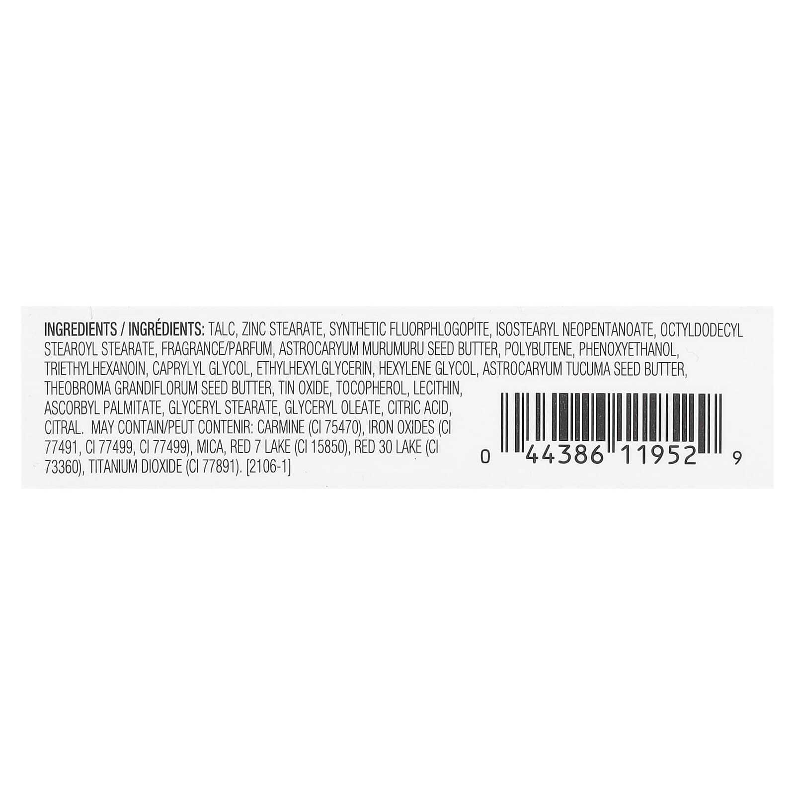 Тальк, стеарат цинка, синтетический фторфлогопит, изостеарил неопентаноат, октилдодецил стеароил стеарат, отдушка (парфюмерная композиция), масло семян мурумуру (Astrocaryum murumuru), полибутен, феноксиэтанол, триэтилгексаноин, каприлилгликоль, этилгексилглицерин, гексиленгликоль, масло семян астрокариума (Astrocaryum tucuma), масло семян купуасу (Theobroma grandiflorum), оксид олова, токоферол, лецитин, аскорбил пальмитат., глицерил стеарат, глицерил олеат, лимонная кислота, цитраль, может содержать кармин (CI 75470), оксиды железа (CI 77491, CI 77499), CI 77499), слюда, краситель красный 7 лак (CI 15850), краситель красный 30 лак (CI 73360), диоксид титана (CI 77891).