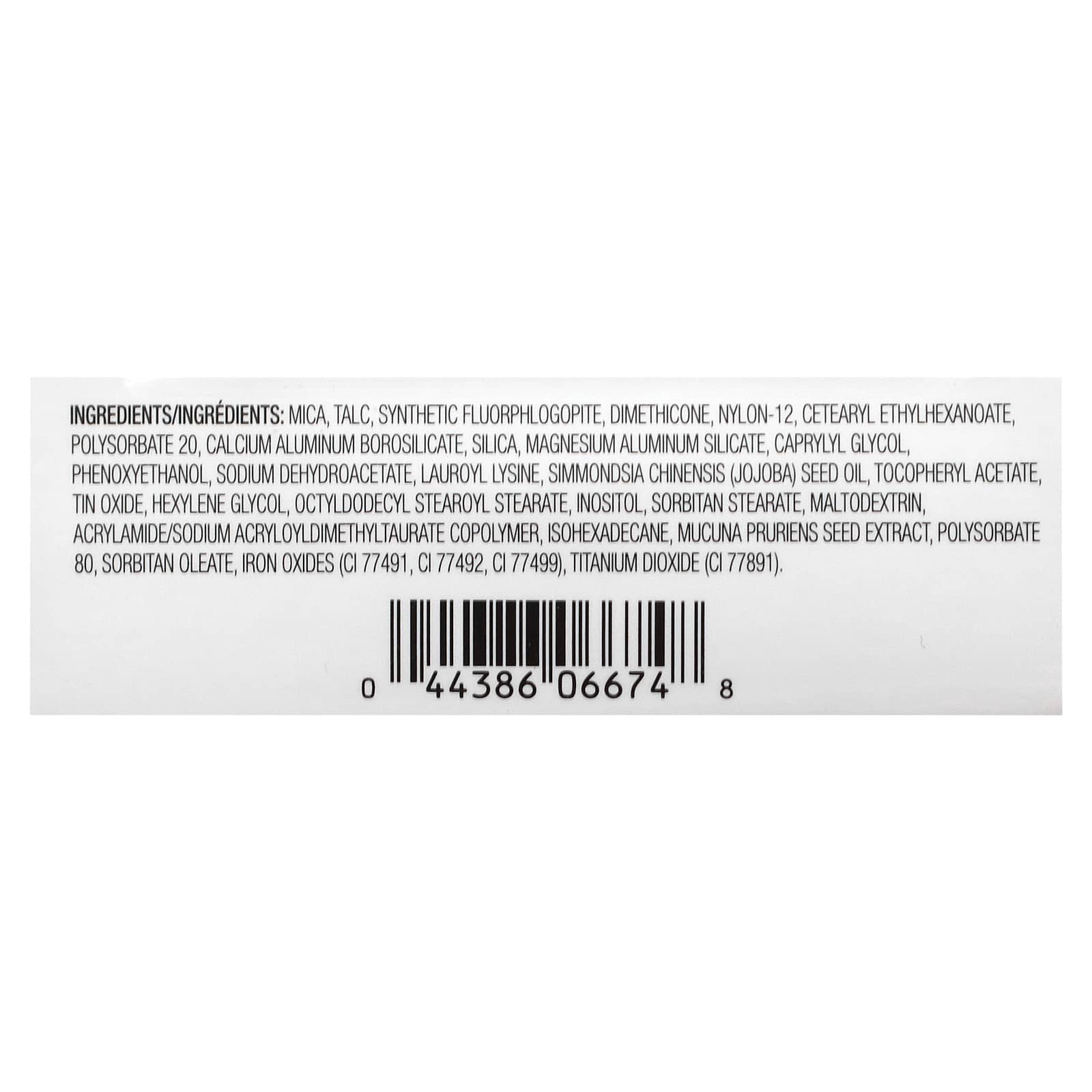 Слюда, тальк, синтетический фторфлогопит, диметикон, нейлон-12, цетеариловый этилгексаноат, полисорбат 20, кальций алюминий боросиликат, диоксид кремния, алюмосиликат магния, каприлилгликоль, феноксиэтанол, дегидроацетат натрия, лаурил лизин, масло из семян жожоба (Simmondsia chinensis), токоферилацетат, оксид олова, гексиленгликоль, октилдодецил стеароил стеарат, инозитол, сорбитан стеарат, мальтодекстрин, акриламид/натрия акрилоилдиметилтаурат сополимер, изогексадекан, экстракт семян мукуны жгучей, полисорбат 80, сорбитанолеат, оксиды железа (CI 77491, CI 77492, CI 77499), диоксид титана (CI 77891).