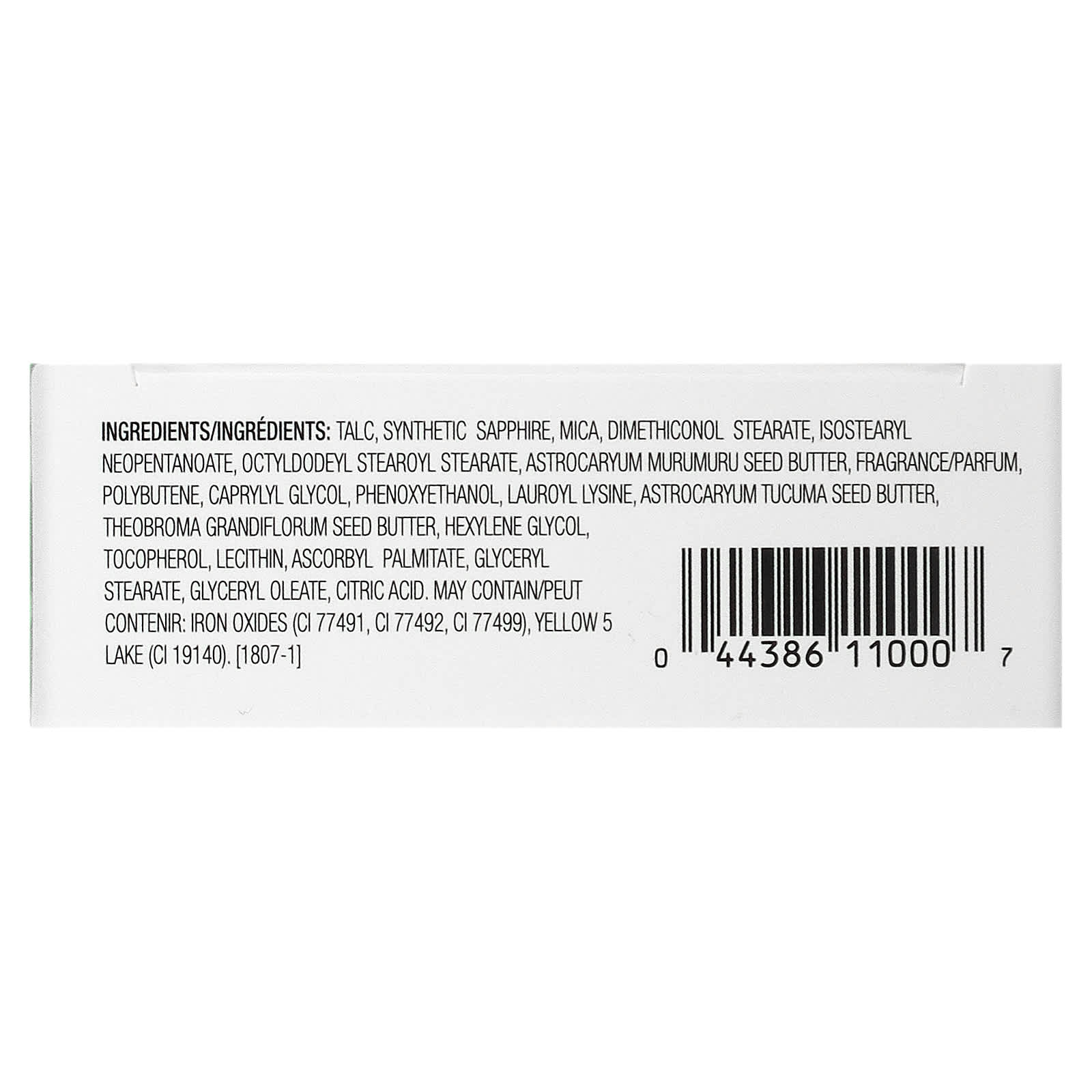 Тальк, синтетический сапфир, слюда, диметиконол стеарат, изостеарил неопентаноат, октилдодецил стеароил стеарат, масло семян мурумуру (Astrocaryum murumuru), отдушка, полибутен, каприлилгликоль, феноксиэтанол, лаурил лизин, масло семян астрокариума (Astrocaryum tucuma), масло семян купуасу (Theobroma grandiflorum), гексиленгликоль, токоферол, лецитин, аскорбил пальмитат, глицерил стеарат, глицерил олеат, лимонная кислота. может содержать оксиды железа (CI 77491, CI 77492, CI 77499), краситель желтый 5 (CI 19140).