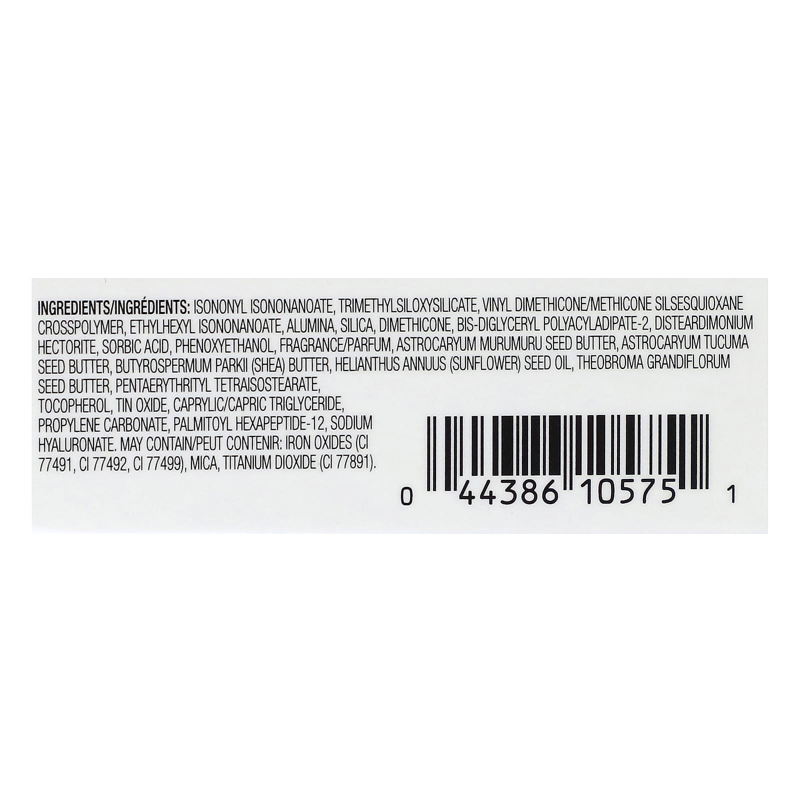 Изононил изононаноат, триметилсилоксисиликат, винил диметикон/метикон силсесквиоксан кроссполимер, этилгексил изононаноат, оксид алюминия, диоксид кремния, диметикон, бис-диглицерил полиациладипат-2, дистеардимония гекторит, сорбиновая кислота, феноксиэтанол, отдушка/парфюмерная композиция, масло семян мурумуру (Astrocaryum murumuru), масло семян астрокариума (Astrocaryum tucuma), масло ши (Butyrospermum parkii), масло семян подсолнечника (Helianthus annuus), масло семян купуасу (Theobroma grandiflorum), пентаэритритилтетраизостеарат, токоферол, оксид олова, каприловый/каприновый триглицерид, пропилен карбонат, пальмитоил гексапептид-12, гиалуронат натрия. Может содержать оксиды железа (CI77491, CI77492, CI77499), слюда, диоксид титана (CI 77891).