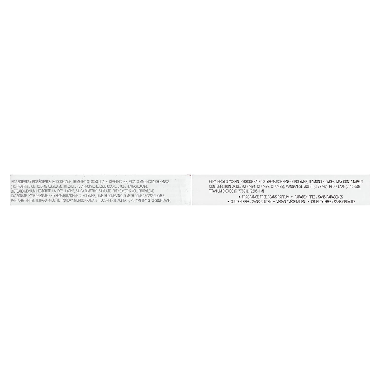 Изододекан, триметилсилоксисиликат, диметикон, слюда, масло из семян жожоба (Simmondsia chinensis), c30-45 алкилдиметилсилил полипропилсилcесквиоксан, циклопентасилоксан, дистеардимония гекторит, лаурил лизин, диметил силилат диоксида кремния, феноксиэтанол, пропиленкарбонат, гидрогенизированный сополимер бутадиена и стирола, диметикон/винил диметикон кроссполимер, пентаэритритил тетра-ди-трет-бутил гидроксигидроциннамат, токоферилацетат, полиметилсилсесквиоксан, этилгексилглицерин, гидрогенизированный изопренстирольный сополимер, алмазная пудра. Может содержать / peut contenir: оксиды железа (CI 77491, CI 77492, CI 77499), краситель темно-фиолетовый (CI 77742), краситель красный 7 лак (CI 15850), диоксид титана (CI 77891).