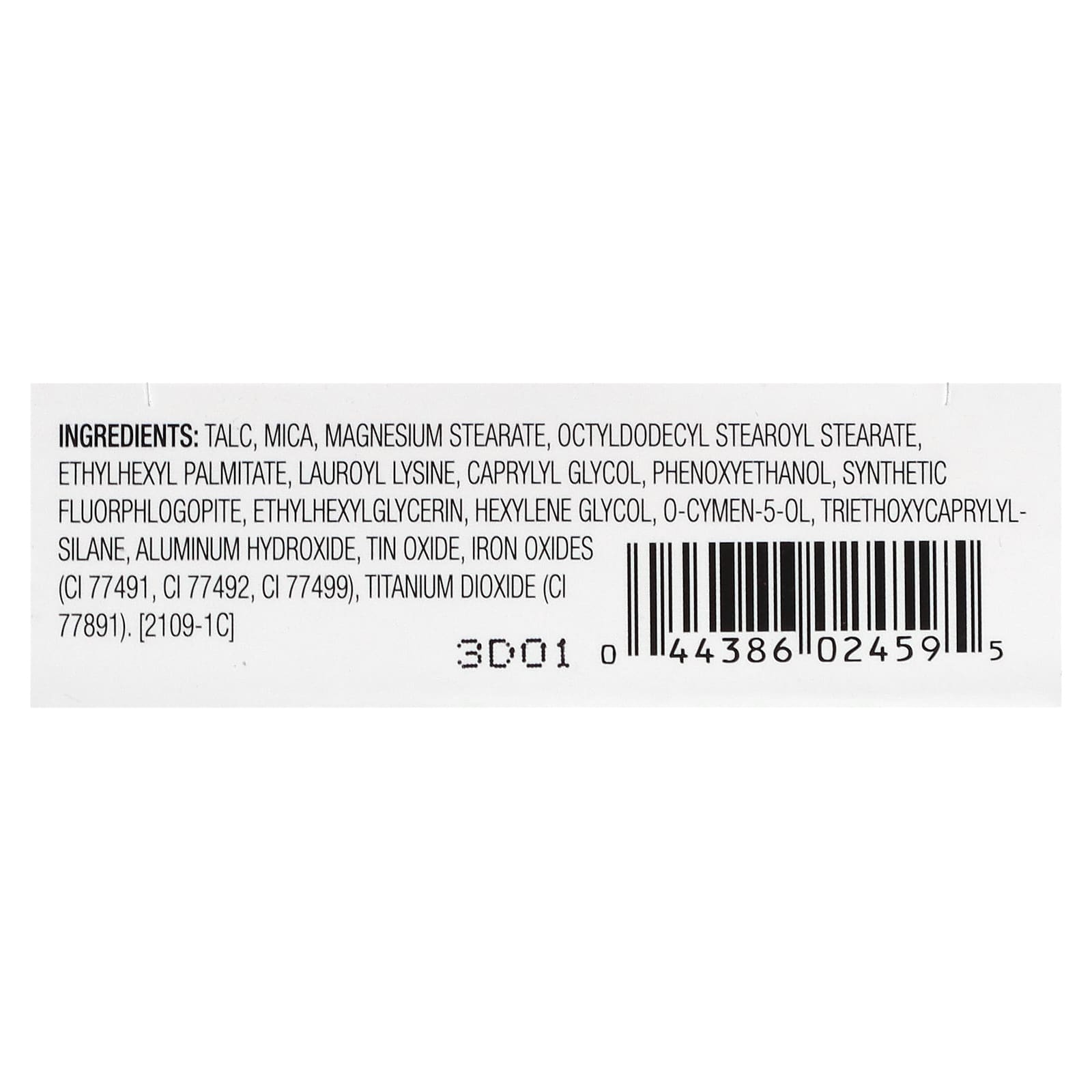 Тальк, слюда, стеарат магния, октилдодецил стеароил стеарат, этилгексил пальмитат, лаурил лизин, каприлилгликоль, феноксиэтанол, синтетический фторфлогопит, этилгексилглицерин, гексиленгликоль, о-цимен-5-ол, триэтоксикаприлилсилан, гидроксид алюминия, оксид олова, оксиды железа (CI 77491, CI 77492, CI 77499), диоксид титана (CI 77891).