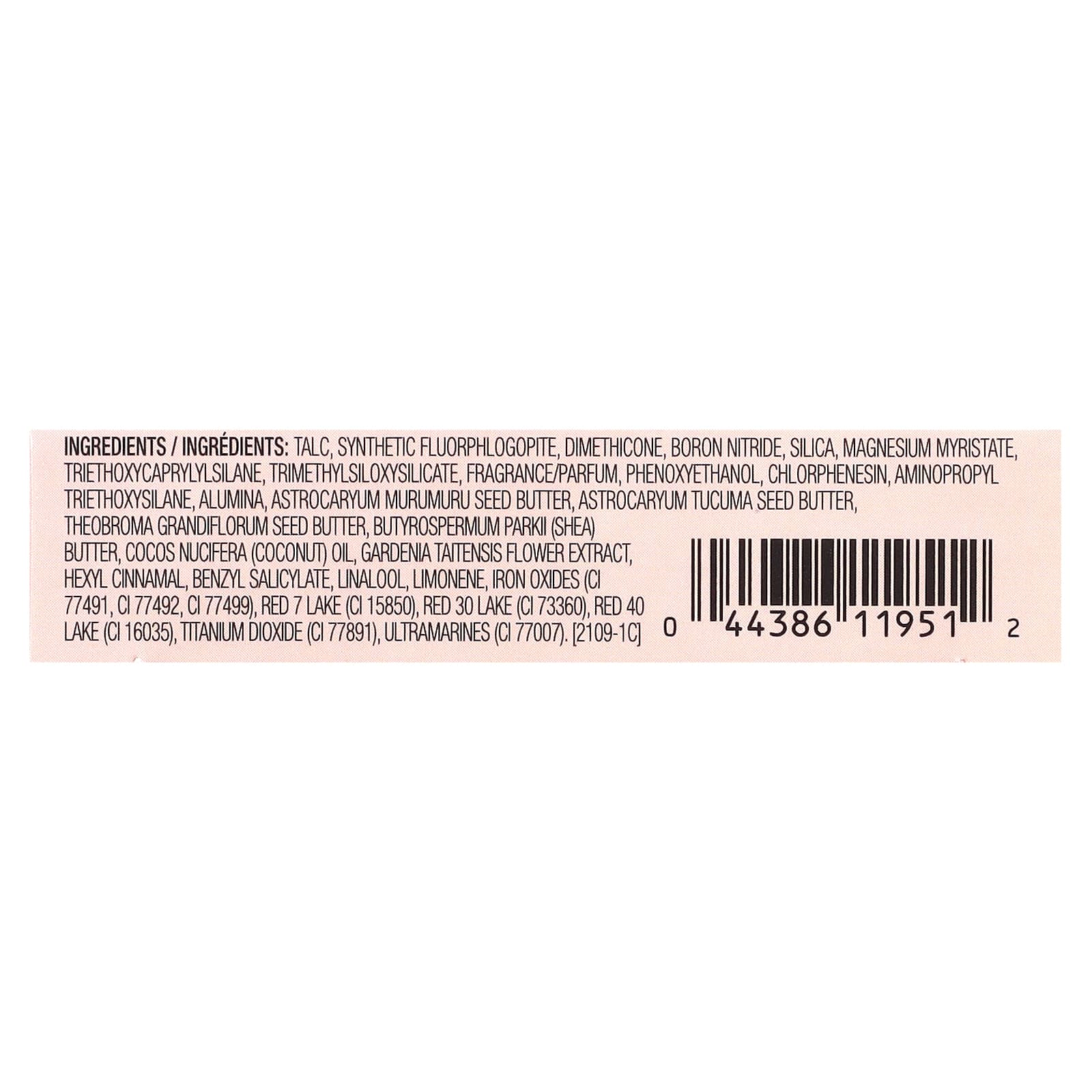 Тальк, синтетический фторфлогопит, диметикон, нитрид бора, диоксид кремния, миристат магния, триэтоксикаприлилсилан, триметилсилоксисиликат, отдушка, феноксиэтанол, хлорфенезин, аминопропил триэтоксисилан, оксид алюминия, масло семян мурумуру (Astrocaryum murumuru), масло семян астрокариума (Astrocaryum tucuma), масло семян купуасу (Theobroma grandiflorum), масло ши (Butyrospermum parkii), кокосовое масло (Cocos nucifera), экстракт цветков гардении таитянской (Gardenia taitensis), гексил циннамал, бензилсалицилат, линалоол, лимонен, оксиды железа (CI 77491, CI 77492, CI 77499), краситель красный 7 лак (CI 15850), краситель красный 30 лак (CI 73360), краситель красный 40 лак (CI 16035), диоксид титана (CI 77891), ультрамарины (CI 77007).