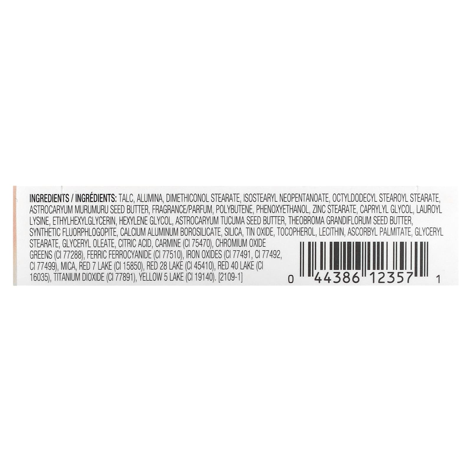 синтетический фторфлогопит, кальций алюминий боросиликат, диоксид кремния, оксид олова, токоферол, лецитин, аскорбил пальмитат, глицерил стеарат, глицерил олеат, лимонная кислота, кармин (CI 75470), хромовую зелень (CI 77288), берлинскую лазурь (CI 77510), оксиды железа (CI 77491, CI 77492, CI 77499), слюда, краситель красный 7 лак (CI 15850), краситель красный 28 (CI 45410), краситель красный 40 лак (CI 16035), диоксид титана (CI 77891), краситель желтый 5 (CI 19140).