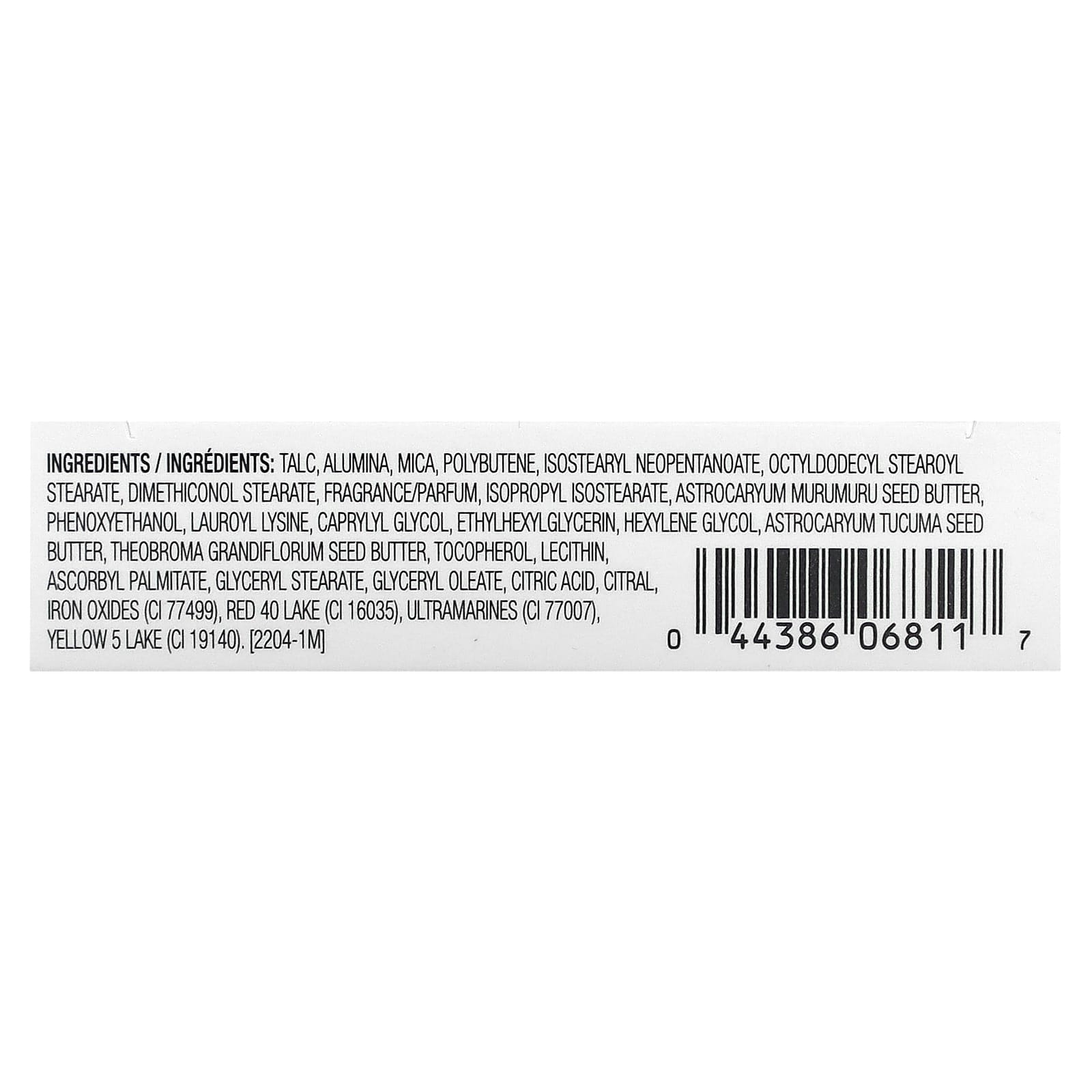 Тальк, оксид алюминия, слюда, полибутен, изостеарил неопентаноат, октилдодецил стеароил стеарат, диметиконол стеарат, отдушка/парфюмерная композиция, изопропил изостеарат, масло семян мурумуру (Astrocaryum murumuru), феноксиэтанол, лаурил лизин, каприлилгликоль, этилгексилглицерин, гексиленгликоль, масло семян астрокариума (Astrocaryum tucuma), масло семян купуасу (Theobroma grandiflorum), токоферол, лецитин, аскорбил пальмитат, глицерил стеарат, глицерил олеат, лимонная кислота, цитраль, оксиды железа (CI 77499), краситель красный 40 лак (CI 16035), ультрамарины (CI 77007), краситель желтый 5 (CI 19140).