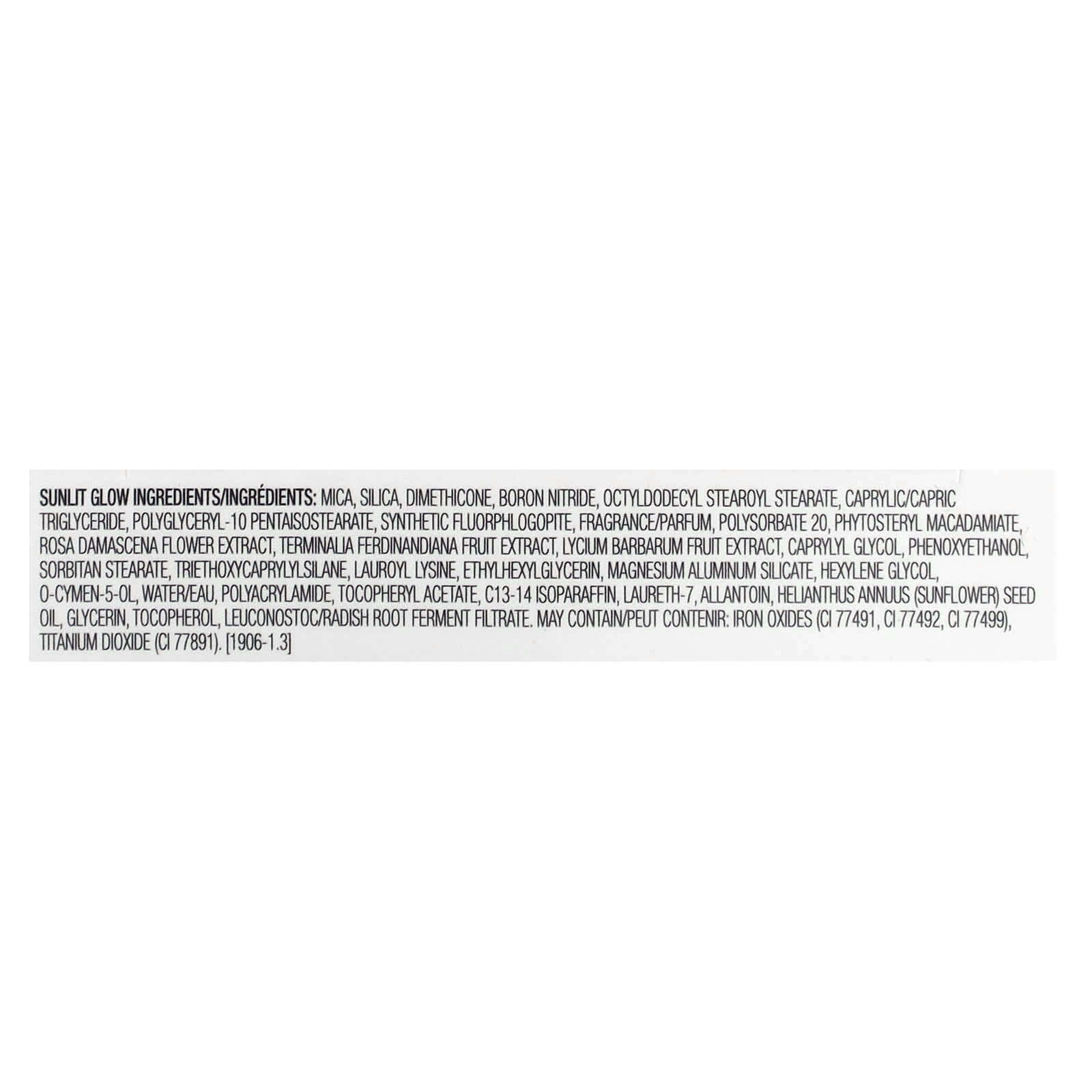 Ингредиенты для сияния солнца: слюда, диоксид кремния, диметикон, нитрид бора, октилдодецил стеароил стеарат, каприловый/каприновый триглицерид, полиглицерил-10 пентаизостеарат, синтетический фторфлогопит, отдушка (парфюмерная композиция), полисорбат 20, фитостерил макадамиат, экстракт цветков дамасской розы (Rosa damascena), экстракт плодов сливы какаду (Terminalia ferdinandiana), экстракт ягод годжи (Lycium barbarum), каприлилгликоль, феноксиэтанол, сорбитан стеарат, триэтоксикаприлилсилан, лаурил лизин, этилгексилглицерин, алюмосиликат магния, гексиленгликоль, 0-цимен-5-ол, вода (Eau), полиакриламид, токоферилацетат, c13-14 изопарафин, лаурет-7, аллантоин, подсолнечное масло (Helianthus annuus), глицерин, токоферол, лейконосток/ферментированный фильтрат корня редиса. может содержать оксиды железа (CI 77491, CI 77492, (CI 77499) диоксид титана (CI 77891).
