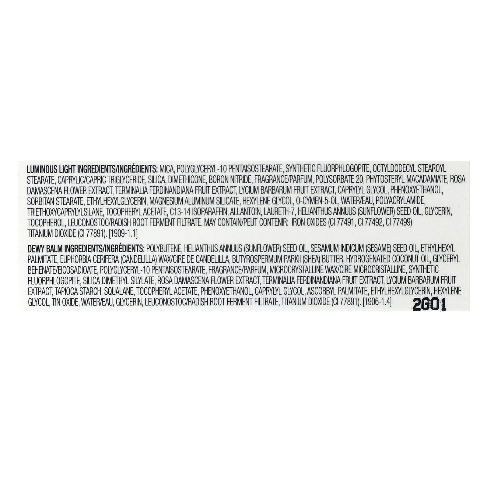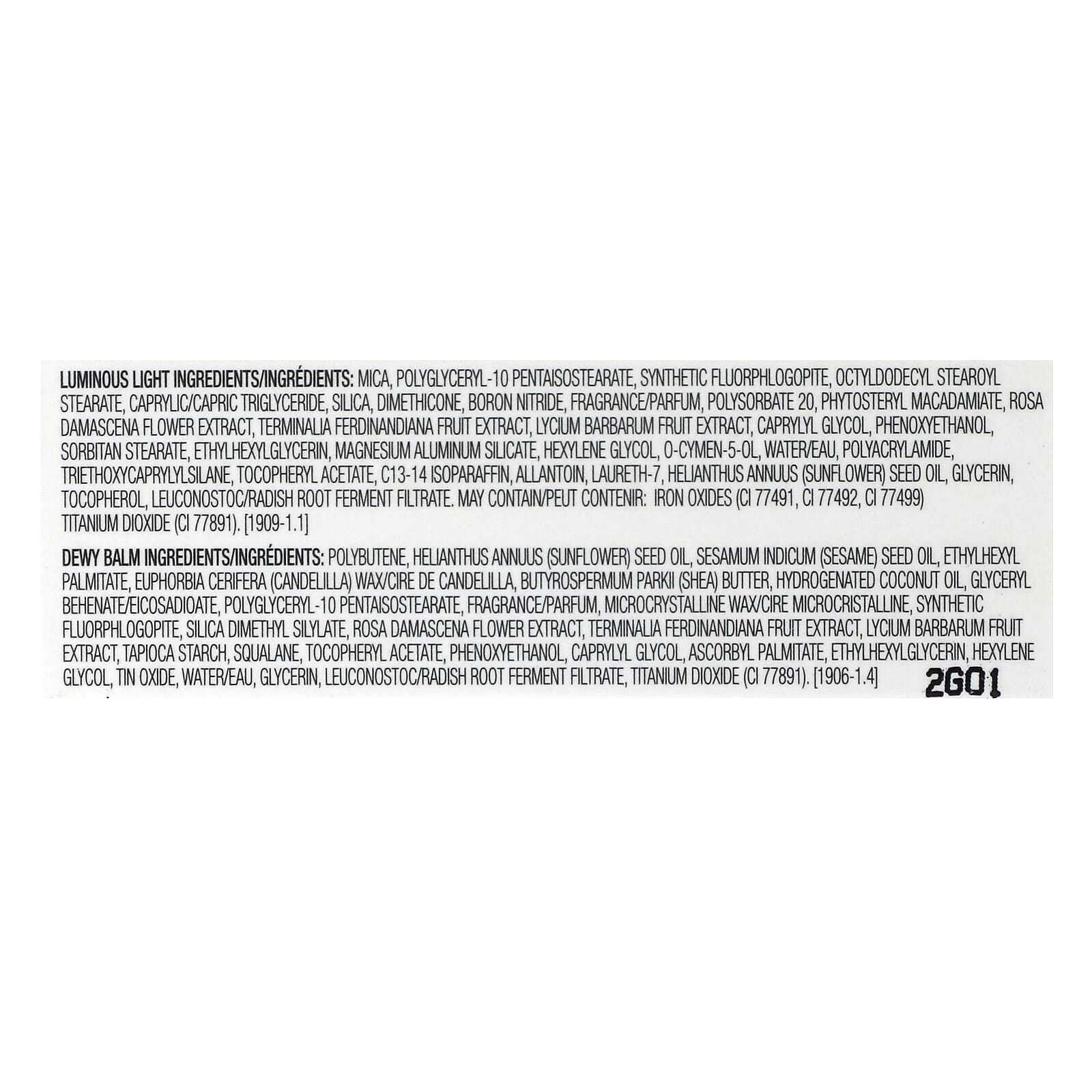 Сияющие и легкие ингредиенты: слюда, полиглицерил-10 пентаизостеарат, синтетический фторфлогопит, октилдодецил стеароил стеарат, каприловый/каприновый триглицерид, диоксид кремния, диметикон, нитрид бора, отдушка (парфюмерная композиция), полисорбат 20, фитостерил макадамиат, экстракт цветков дамасской розы (Rosa damascena), экстракт плодов сливы какаду (Terminalia ferdinandiana), экстракт ягод годжи (Lycium barbarum), каприлилгликоль, феноксиэтанол, сорбитан стеарат, этилгексилглицерин, алюмосиликат магния, гексиленгликоль, о-цимен-5-ол, вода, полиакриламид, триэтоксикаприлилсилан, токоферилацетат, c13-14 изопарафин, аллантоин, лаурет-7, подсолнечное масло (Helianthus annuus), глицерин, токоферол, лейконосток/ферментированный фильтрат корня редиса. может содержать оксиды железа (CI 77491, CI 77492, (CI 77499) диоксид титана (CI 77891).