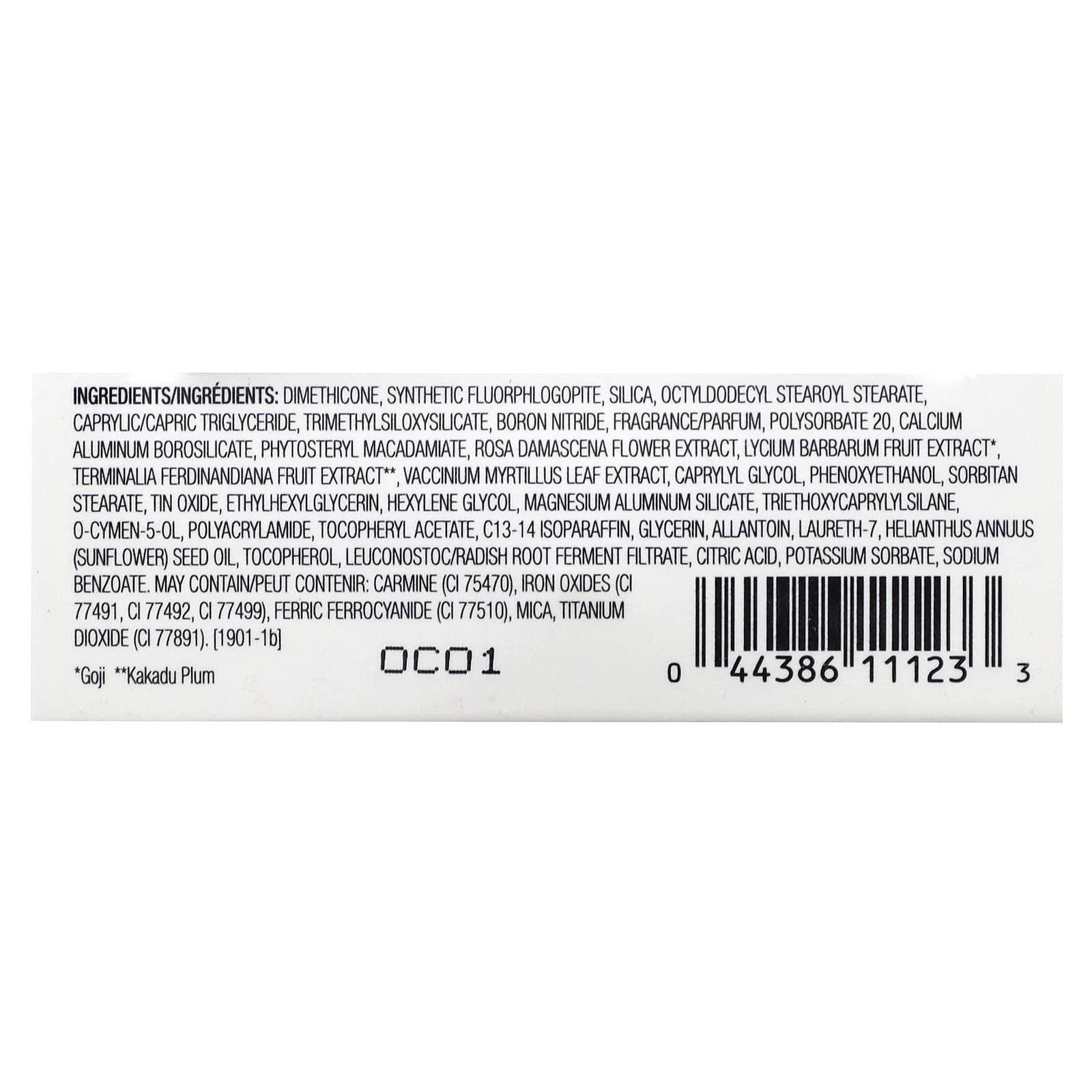диметикон, синтетический фторфлогопит, диоксид кремния, октилдодецил стеароил стеарат, каприловый/каприновый триглицерид, триметилсилоксисиликат, нитрид бора, отдушка (парфюмерная композиция), полисорбат 20, кальций алюминий боросиликат, фитостерил макадамиат, экстракт цветков дамасской розы (Rosa damascena), экстракт ягод годжи (Lycium barbarum)*, экстракт плодов Terminalia ferdinandiana **, экстракт листьев Vaccinium myrtillus, каприлилгликоль, феноксиэтанол, сорбитан стеарат, оксид олова, этилгексилглицерин, гексиленгликоль, алюмосиликат магния, триэтоксикаприлилсилан, 0-цимен-5-ол, полиакриламид, токоферилацетат, c13-14 изопарафин, глицерин, аллантоин, лаурет-7, подсолнечное масло (Helianthus annuus), токоферол, лейконосток/ферментированный фильтрат корня редиса, лимонная кислота, сорбат калия, бензоат натрия. Может содержать в пищеварительном тракте кармин (CI 75470)., оксиды железа (CI 77491, CI 77492, CI 77499), берлинская лазурь (CI 77510), слюда, диоксид титана (CI 77891).