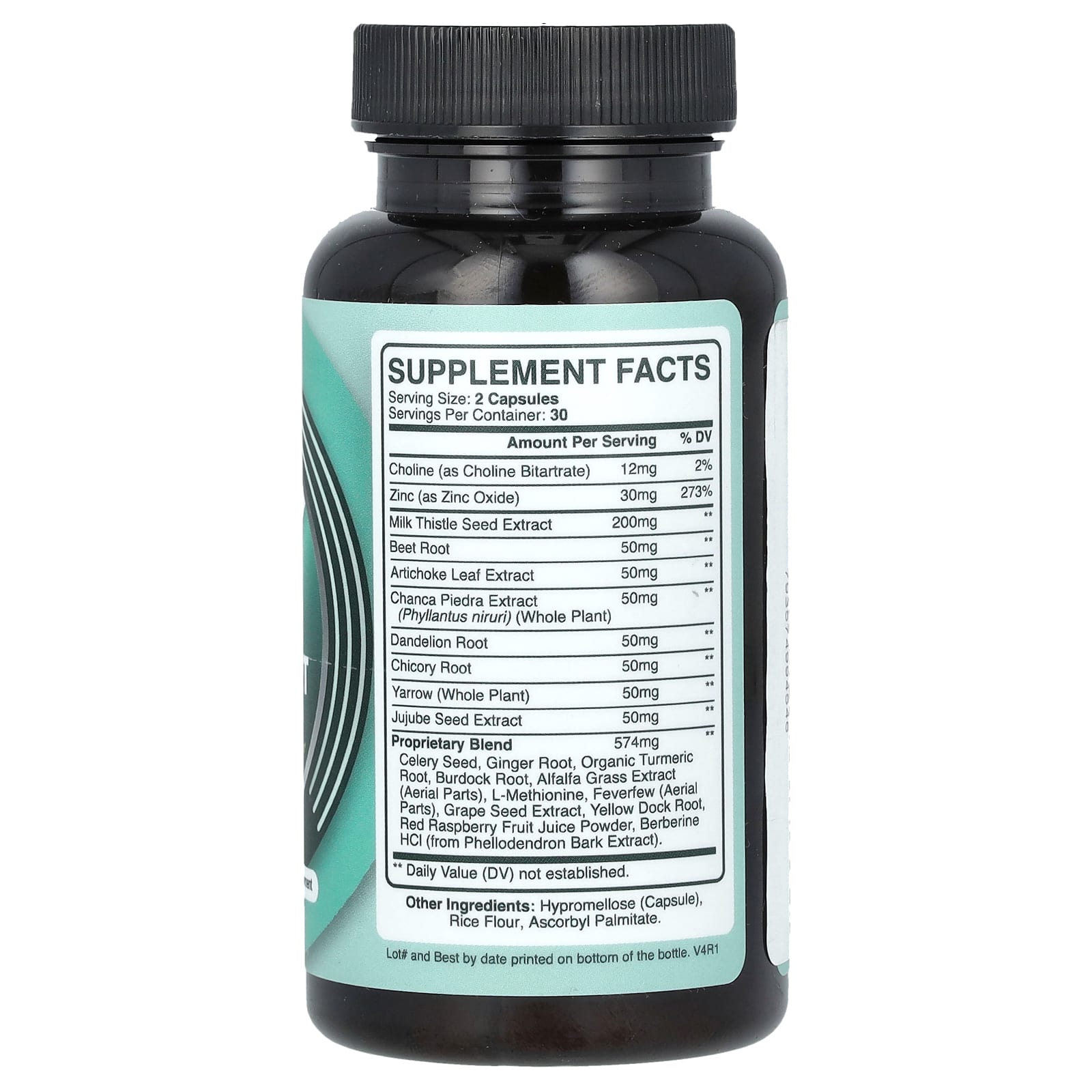 | Запатентованная смесь семена сельдерея, корень имбиря, корень органической куркумы, корень лопуха, экстракт ростков люцерны (надземные части), L-метионин, надземные части пиретрума, экстракт виноградных косточек, корень щавеля желтого, порошок из сока плодов красной малины, берберина гидрохлорид (из органического дендрона экстракт коры) | 574 мг | ** |