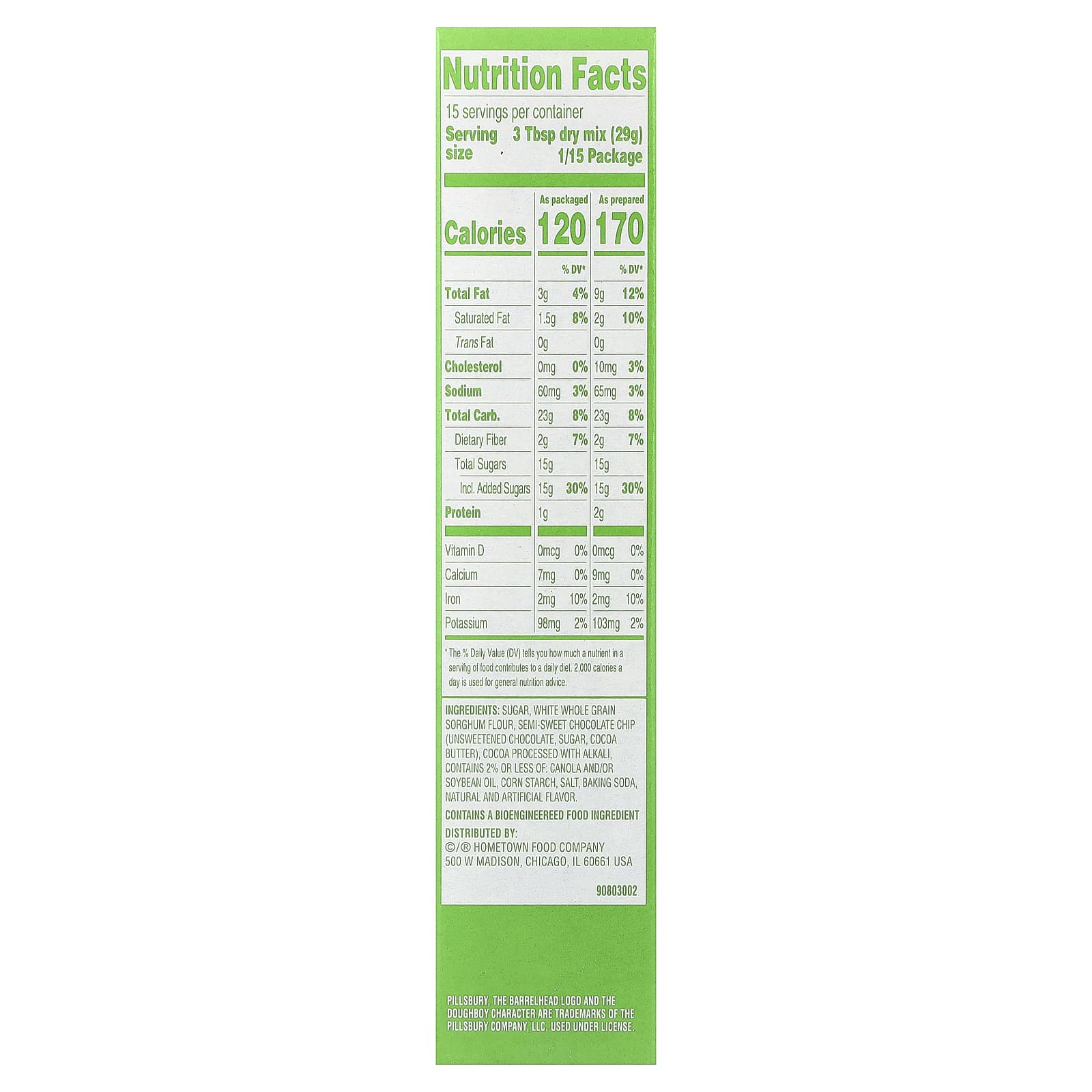 сахара, белая цельнозерновая мука из сорго, полусладкая шоколадная крошка (горький шоколад, сахар, какао-масло), какао, обработанное щелочью, содержит 2% или меньше рапсового масла, кукурузный крахмал, соль, Пищевая сода, натуральные и искусственные ароматизаторы.