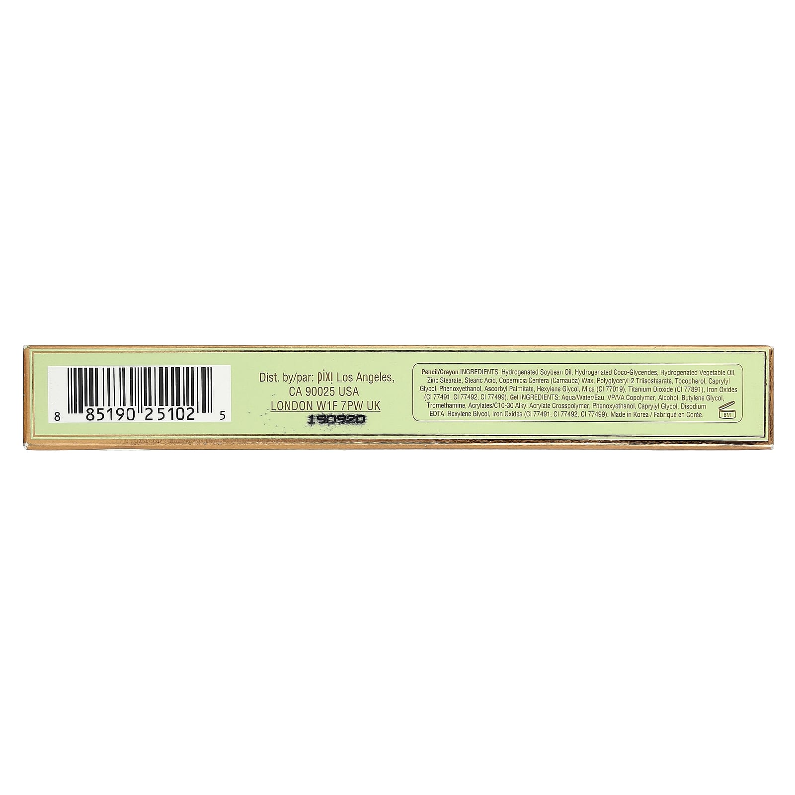 Карандаш. Гидрогенизированное соевое масло, гидрогенизированные кокоглицериды, гидрогенизированное растительное масло, стеарат цинка, стеариновая кислота, карнаубский воск (Copernicia cerifera), полиглицерил-2 триизостеарат, токоферол, каприлилгликоль, феноксиэтанол, аскорбил пальмитат, гексиленгликоль, слюда (CI 77019), диоксид титана (CI 77891), оксиды железа (CI 77499, CI 77491, CI 77492).