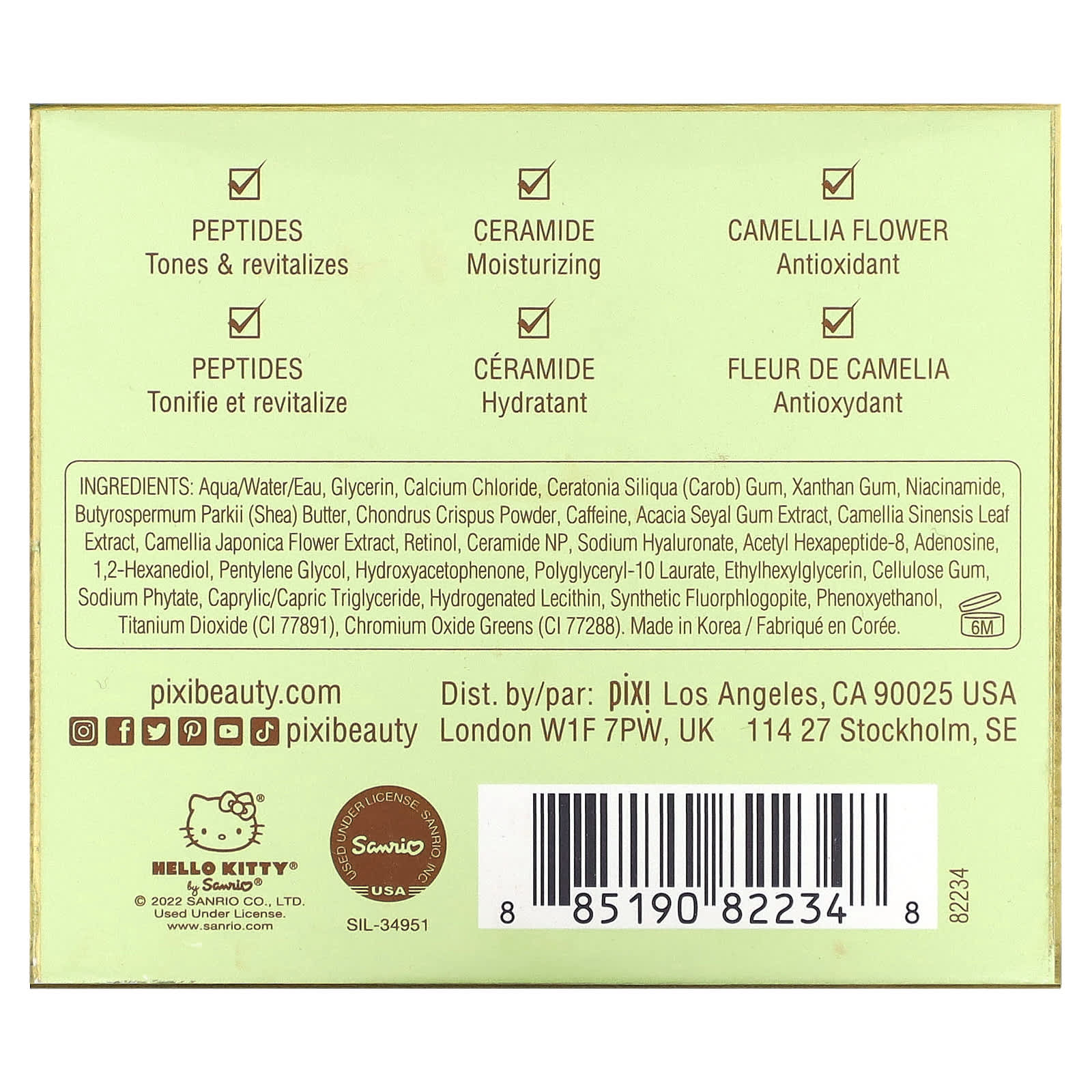 Вода, глицерин, хлорид кальция, камедь рожкового дерева (Ceratonia siliqua), ксантановая камедь, никотинамид, масло ши (Butyrospermum parkii), порошок из ирландского мха (Chondrus crispus), кофеин, экстракт камеди акации сеяльской (Acacia seyal), экстракт листьев зеленого чая (Camellia sinensis), экстракт цветков камелии японской (Camellia japonica), ретинол, керамид NP, гиалуронат натрия, ацетил гексапептид-8, аденозин, 1,2-гександиол, пентилен гликоль, гидроксиацетофенон, полиглицерил-10 лаурат, этилгексилглицерин, целлюлозная камедь, фитат натрия, каприловый/каприновый триглицерид, гидрогенизированный лецитин, синтетический фторфлогопит, феноксиэтанол, диоксид титана (CI 77891), хромовая зелень (CI 77288).