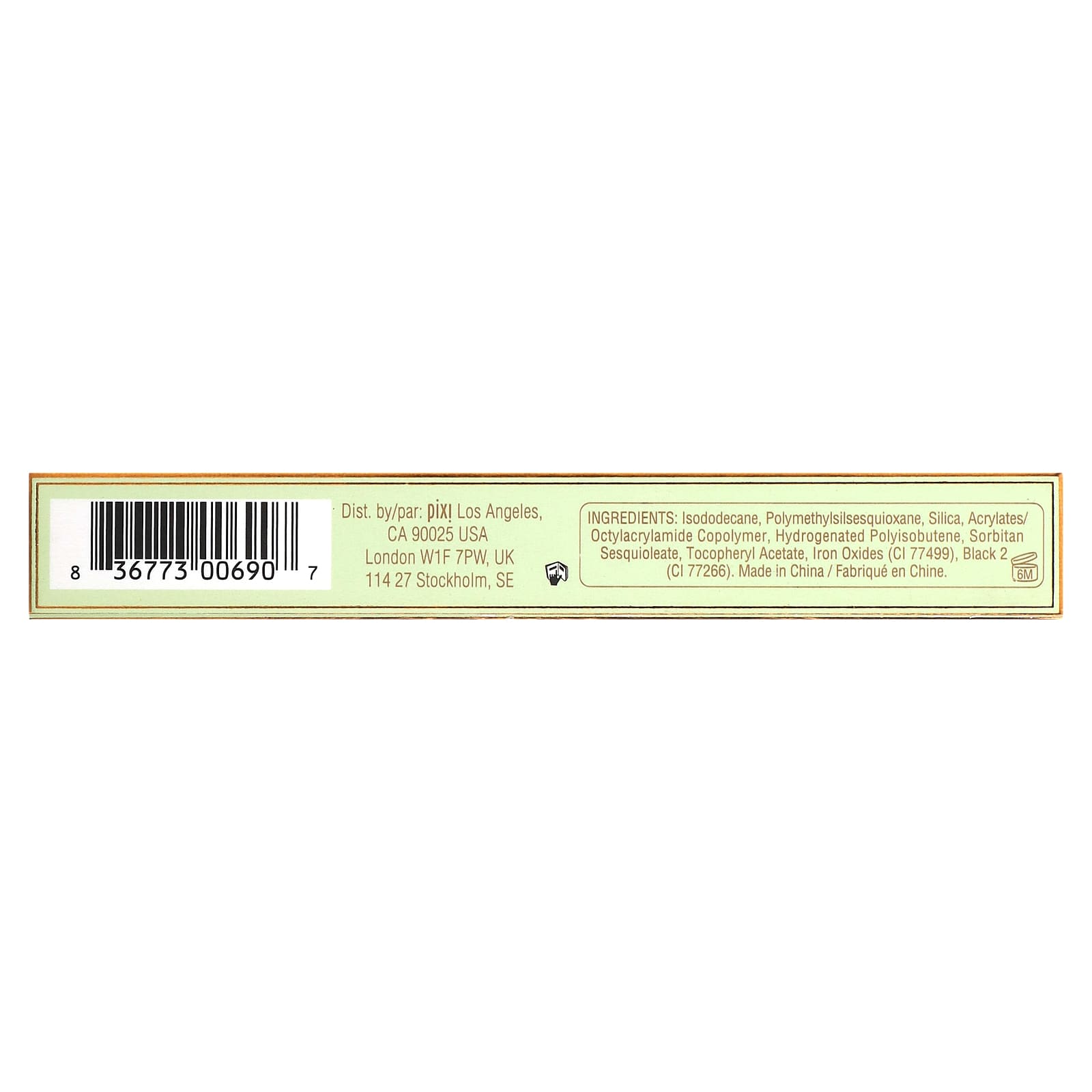 изододекан, полиметилсилсесквиоксан, диоксид кремния, акрилат/октилакриламид сополимер, гидрогенизированный полиизобутен, сорбитана сесквиолеат, токоферилацетат, оксиды железа (CI 77499), краситель черный 2 (CI 77266).
