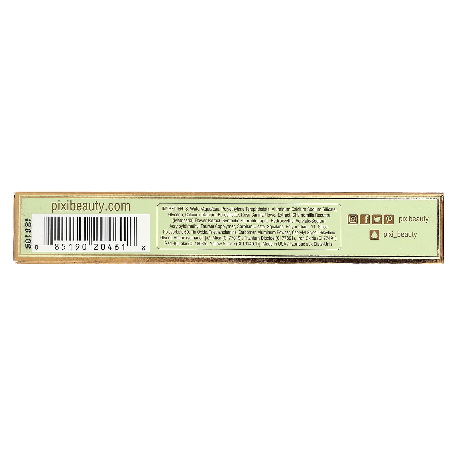 Вода (Aqua), полиэтилентерефталат, силикат алюминия, кальция и натрия, глицерин, боросиликат кальция и титана, экстракт цветков шиповника (Rosa canina), экстракт цветков ромашки лекарственной (Chamomilla recutita), синтетический фторфлогопит, гидроксиэтил акрилат/натрия акрилоилдиметилтаурата сополимер, сорбитанолеат, сквалан, полиуретан-11, диоксид кремния, полисорбат 60, оксид олова, триэтаноламин, карбомер, алюминиевый порошок, каприлилгликоль, гексиленгликоль, феноксиэтанол. [+/- слюда (CI 77019), диоксид титана (CI 77891), оксиды железа (CI 77491), краситель красный 40 лак (CI 16035), краситель желтый 5 лак (CI 19140:1)].