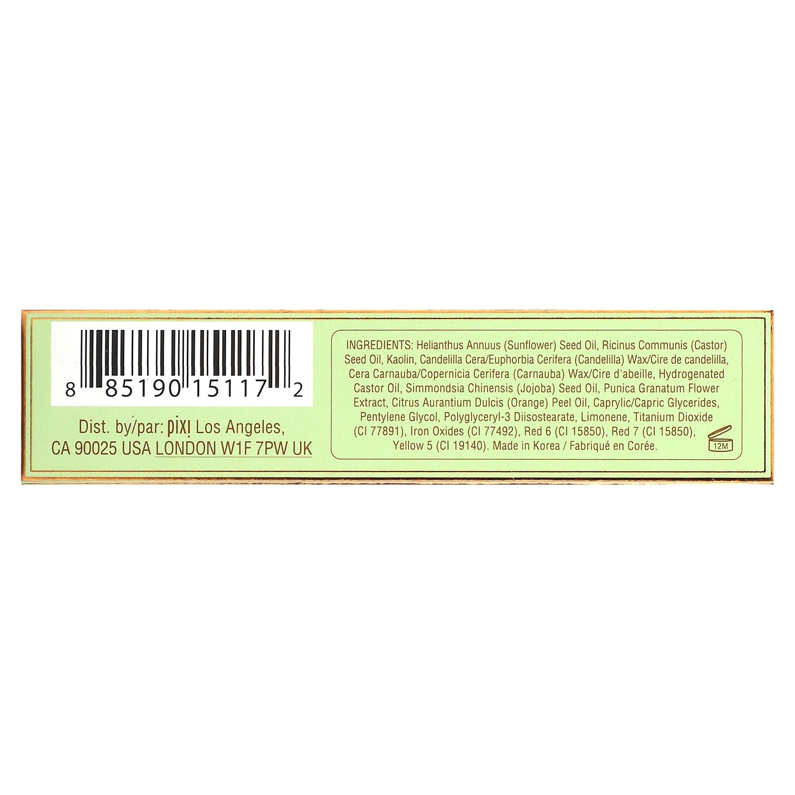 Подсолнечное масло (Helianthus annuus), касторовое масло (Ricinus communis), каолин, канделильский воск (Candelilla cera/Euphorbia cerifera), карнаубский воск (Copernicia cerifera), гидрогенизированное касторовое масло, масло из семян жожоба (Simmondsia chinensis), экстракт цветков граната (Punica granatum), масло из цедры апельсина (Citrus aurantium dulcis), каприловые/каприновые глицериды, пентилен гликоль, полиглицерил-3 диизостеарат, лимонен, диоксид титана (CI 77891), оксиды железа (CI 77492), краситель красный 6 (CI 15850), краситель красный 7 (CI 15850), краситель жёлтый 5 (CI 19140).