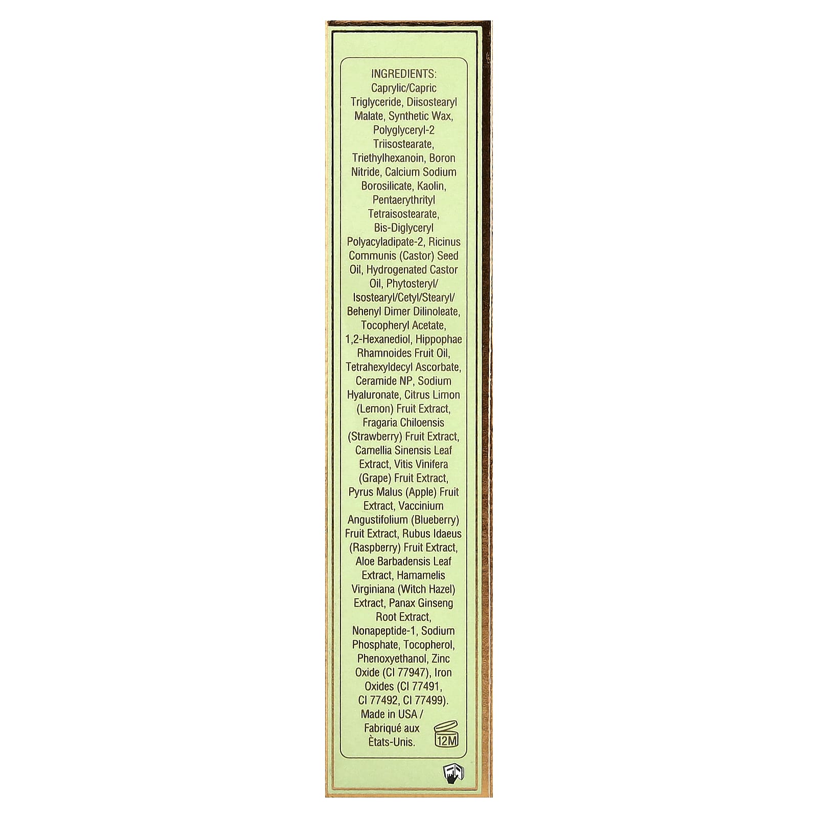 Каприловый/каприновый триглицерид, диизостеарил малат, синтетический воск, полиглицерил-2 триизостеарат, триэтилгексаноин, нитрид бора, кальций натрий боросиликат, каолин, пентаэритритил тетраизостеарат, бис-диглицерил полиациладипат-2, касторовое масло (Ricinus communis), гидрогенизированное касторовое масло, фитостерил/изостеарил/цетил/стеарил/бегенил димер дилинолеат, токоферилацетат, 1,2-гександиол, масло из плодов облепихи крушиновидной (Hippophae rhamnoides), тетрагексилдецил аскорбат, керамид NP, гиалуронат натрия, экстракт плодов лимона (Citrus limon), экстракт ягод клубники (Fragaria chiloensis), экстракт листьев зелёного чая (Camellia sinensis), экстракт плодов винограда (Vitis vinifera), экстракт яблока (Pyrus malus), экстракт ягод голубики (Vaccinium angustifolium), экстракт ягод малины (Rubus idaeus), экстракт листьев алоэ вера (Aloe barbadensis), экстракт гамамелиса (Hamamelis virginiana), экстракт корня женьшеня (Panax ginseng), нонапептид-1, фосфат натрия, токоферол, феноксиэтанол, оксид цинка (CI 77947), оксиды железа (CI 77491, CI 77492, CI 77499).