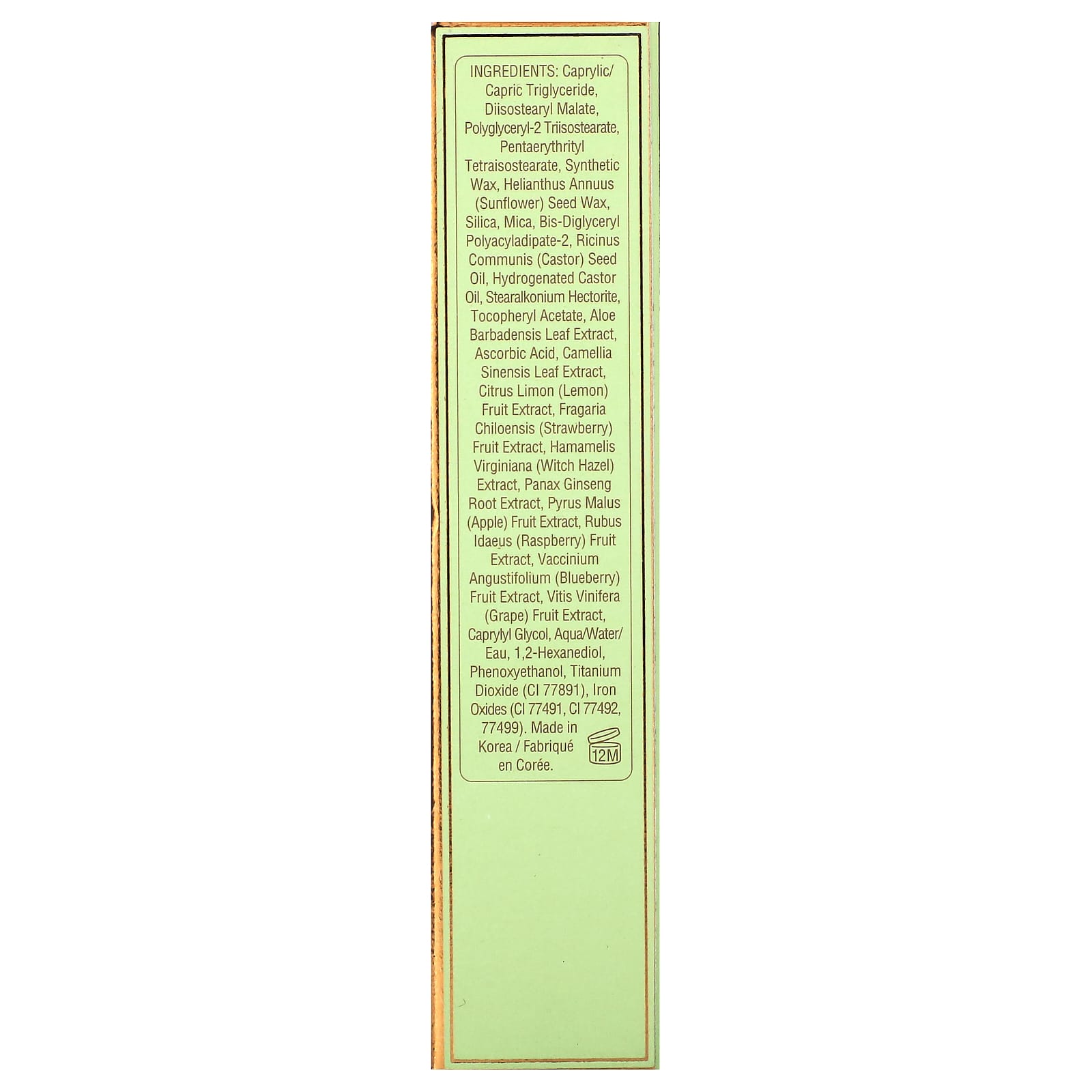 Каприловый/каприновый триглицерид, диизостеарил малат, полиглицерил-2 триизостеарат, пентаэритритил тетраизостеарат, синтетический воск, воск из семян подсолнечника (Helianthus annuus), диоксид кремния, слюда, бис-диглицерил полиациладипат-2, касторовое масло (Ricinus communis), гидрогенизированное касторовое масло, стеаралкония гекторит, токоферилацетат, экстракт листьев алоэ вера (Aloe barbadensis), аскорбиновая кислота, экстракт листьев зелёного чая (Camellia sinensis), экстракт плодов лимона (Citrus limon), экстракт ягод клубники (Fragaria chiloensis), экстракт гамамелиса (Hamamelis virginiana), экстракт корня женьшеня (Panax ginseng), экстракт яблока (Pyrus malus), экстракт ягод малины (Rubus idaeus), экстракт ягод голубики (Vaccinium angustifolium), экстракт плодов винограда (Vitis vinifera), каприлилгликоль, вода (Aqua/eau), 1,2-гександиол, феноксиэтанол, диоксид титана (CI 77891), оксиды железа (CI 77491, CI 77492, 77499).