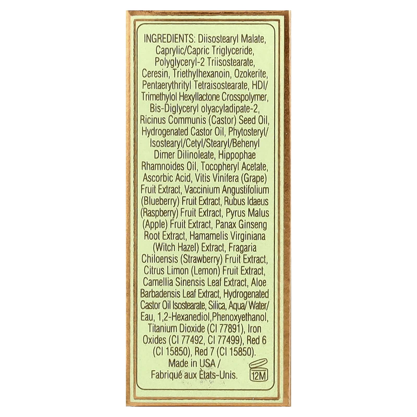 Диизостеарил малат, каприловый/каприновый триглицерид, полиглицерил-2 триизостеарат, церезин, триэтилгексаноин, озокерит, пентаэритритил тетраизостеарат, гександиизоцианат/триметилол хексиллактона кроссполимер, бис-диглицерил олиациладипат-2, касторовое масло (Ricinus communis), гидрогенизированное касторовое масло, фитостерил/изостеарил/цетил/стеарил/бегенил димер дилинолеат, масло облепихи крушиновидной (Hippophae rhamnoides), токоферилацетат, аскорбиновая кислота, экстракт плодов винограда (Vitis vinifera), экстракт ягод голубики (Vaccinium angustifolium), экстракт ягод малины (Rubus idaeus), экстракт яблока (Pyrus malus), экстракт корня женьшеня (Panax ginseng), экстракт гамамелиса (Hamamelis virginiana), экстракт ягод клубники (Fragaria chiloensis), экстракт плодов лимона (Citrus limon), экстракт листьев зелёного чая (Camellia sinensis), экстракт листьев алоэ вера (Aloe barbadensis), изостеарат гидрогенизированного касторового масла, диоксид кремния, вода/eau, 1,2-гександиол, феноксиэтанол, диоксид титана (CI 77891), оксиды железа (CI 77492, CI 77499), краситель красный 6 (CI 15850), краситель красный 7 (CI 15850).
