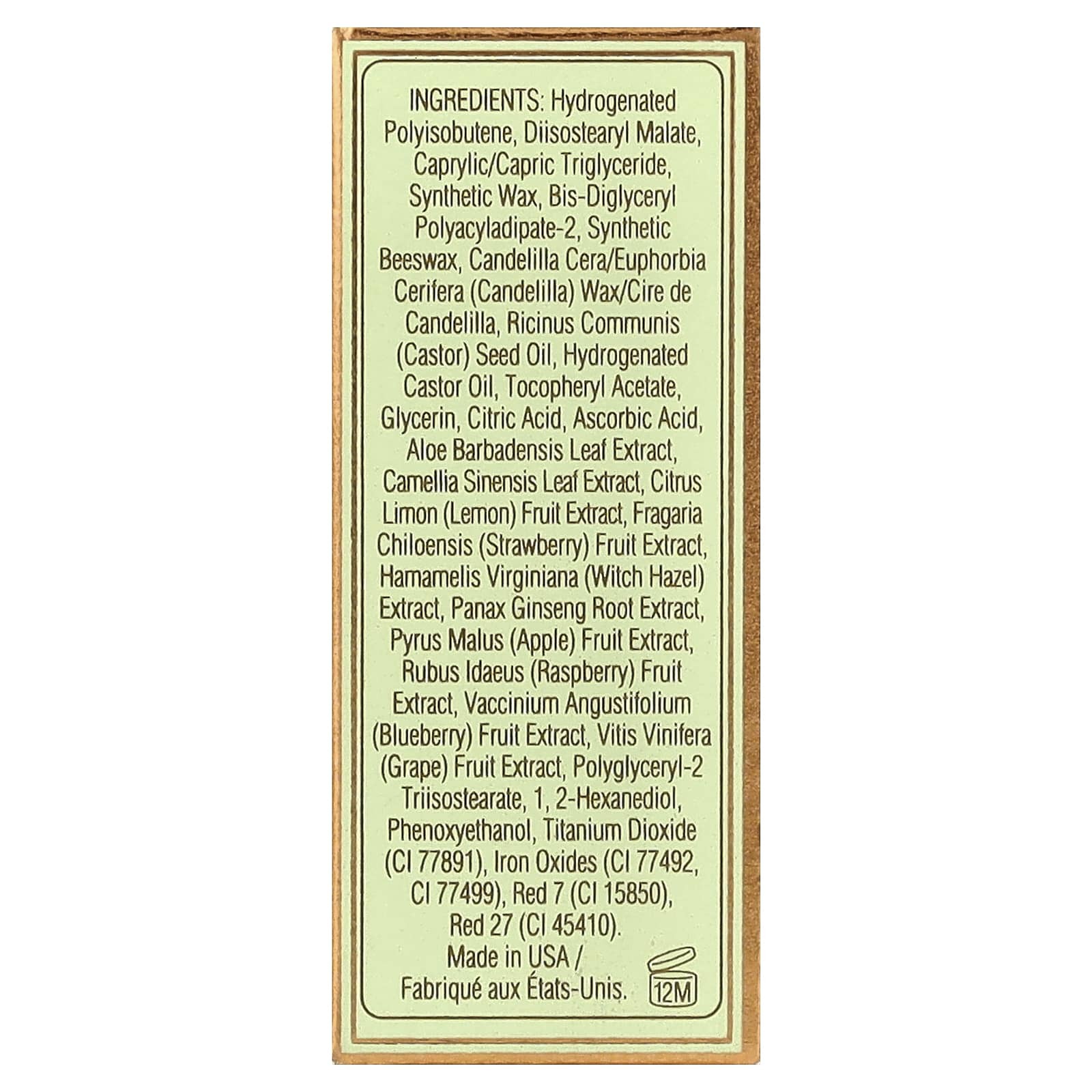 Гидрогенизированный полиизобутен, диизостеарил малат, каприловый/каприновый триглицерид, синтетический воск, бис-диглицерил полиациладипат-2, синтетический воск, канделильский воск (Euphorbia cerifera), касторовое масло (Ricinus communis), гидрогенизированное касторовое масло, токоферилацетат, глицерин, лимонная кислота, аскорбиновая кислота, экстракт листьев алоэ вера (Aloe barbadensis), экстракт листьев зелёного чая (Camellia sinensis), экстракт плодов лимона (Citrus limon), экстракт ягод клубники (Fragaria chiloensis), экстракт гамамелиса (Hamamelis virginiana), экстракт корня женьшеня (Panax ginseng), экстракт яблока (Pyrus malus), экстракт ягод малины (Rubus idaeus), экстракт ягод голубики (Vaccinium angustifolium), экстракт плодов винограда (Vitis vinifera), полиглицерил-2 триизостеарат, 1,2-гександиол, феноксиэтанол, диоксид титана (CI 77891), оксиды железа (CI 77492, CI 77499), краситель красный 7 (CI 15850), краситель красный 27 (CI 45410).