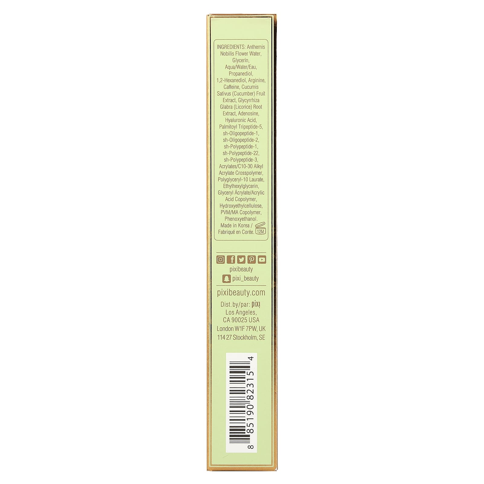 Вода из цветков ромашки английской (Anthemis nobilis), глицерин, вода/вода, пропандиол, 1,2-гександиол, аргинин, кофеин, экстракт плодов огурца (Cucumis sativus), экстракт корня солодки (Glycyrrhiza glabra), аденозин, гиалуроновая кислота, пальмитоил трипептид-5, sh-олигопептид-1, sh-олигопептид-2, sh-полипептид-1, sh-полипептид-22, sh-полипептид-3, акрилат/c10-30 алкил акрилат кроссполимер, полиглицерил-10 лаурат, этилгексилглицерин, сополимер глицерил акрилата/акриловой кислоты, гидроксиэтилцеллюлоза, ПВМ/МА сополимер, феноксиэтанол