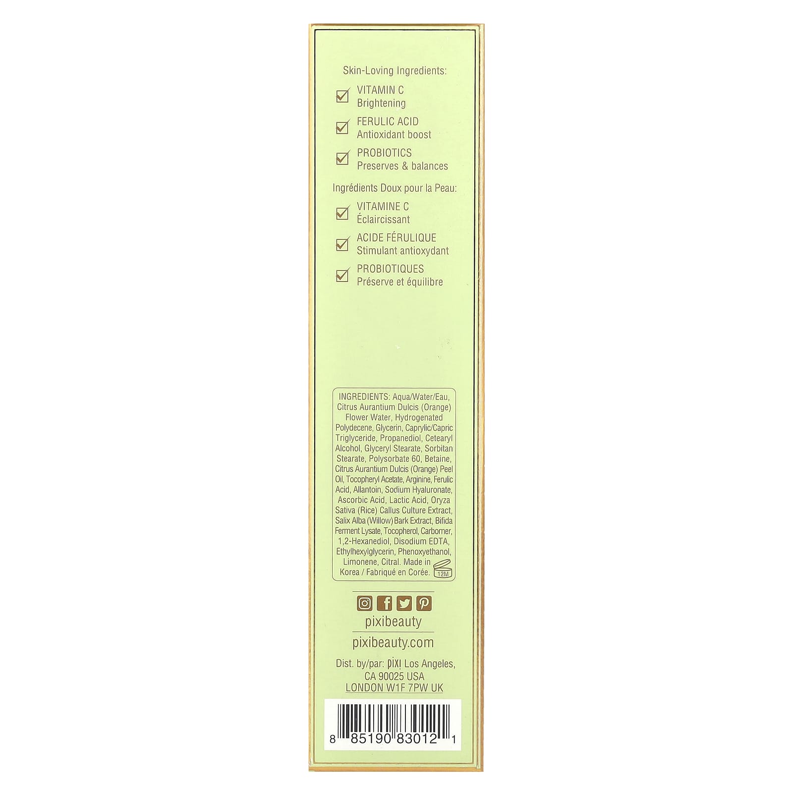 Вода (Eau), вода из цветков апельсина (Citrus aurantium dulcis), токоферилацетат, феруловая кислота, молочная кислота, аскорбиновая кислота, экстракт каллусной культуры риса (Oryza sativa), лизат ферментов бифидобактерий, экстракт коры ивы (Salix alba), каприловый/каприновый триглицерид, гидрогенизированный полидецен, глицерин, пропандиол, глицерил стеарат, цетеариловый спирт, сорбитан стеарат, полисорбат 60, пальмитиновая кислота, стеариновая кислота, бетаин, феноксиэтанол, масло из цедры апельсина (Citrus aurantium dulcis), масло из цедры грейпфрута (Citrus grandis), оливковое масло (Olea europaea), масло из цедры лимона (Citrus limon), масло плодов литцеи кубебы (Litsea cubeba), карбомер, аргинин, гиалуронат натрия, аллантоин, этилгексилглицерин, двунатриевая ЭДТК, 1,2-гександиол, пентилен гликоль, бутиленгликоль, каприлилгликоль.