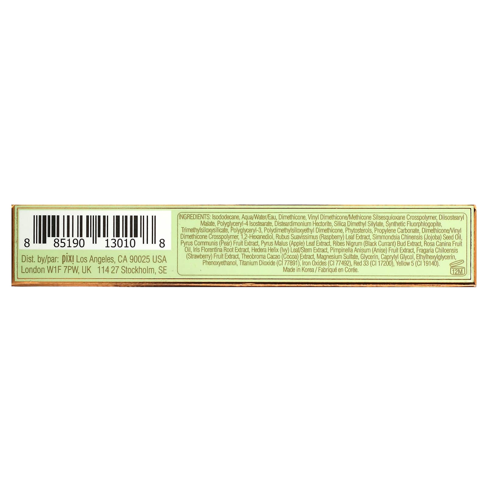 изододекан, вода/вода, диметикон, винил диметикон/метикон силсесквиоксан кроссполимер, диизостеарил малат, полиглицерил-4 изостеарат, дистеардимония гекторит, диметил силилат диоксида кремния, синтетический фторфлогопит, триметилсилоксисиликат, полиглицерил-3, полидиметилсилоксиэтил диметикон, фитостеролы, пропиленкарбонат, диметикон/винил диметикон кроссполимер, 1,2-гександиол, экстракт листьев малины (Rubus suavissimus), масло из семян жожоба (Simmondsia chinensis), экстракт плодов груши (Pyrus communis), экстракт листьев яблони (Pyrus malus), экстракт почек черной смородины (Ribes nigrum), масло шиповника (Rosa canina), экстракт корня ириса флорентийского (Iris florentina), экстракт листьев/стебля плюща (Hedera helix), экстракт плодов аниса (Pimpinella anisum), экстракт ягод клубники (Fragaria chiloensis), экстракт какао (Theobroma cacao), сульфат магния, глицерин, каприлилгликоль, этилгексилглицерин, феноксиэтанол, диоксид титана (CI 77891), оксиды железа (CI 77492), краситель красный 33 (CI 17200), краситель желтый 5 (CI 19140).