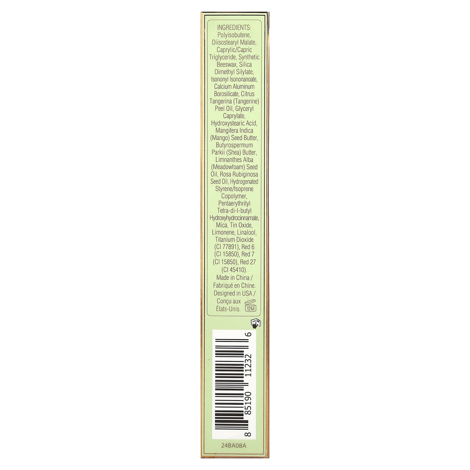 полиизобутен, диизостеарил малат, каприловый/каприновый триглицерид, синтетический воск, диметил силилат диоксида кремния, изононил изононаноат, кальций алюминий боросиликат, масло из цедры мандарина (Citrus tangerina), глицерил каприлат, гидроксистеариновая кислота, масло из косточек манго (Mangifera indica), масло ши (Butyrospermum parkii), масло из семян пенника лугового (Limnanthes alba), масло семян шиповника (Rosa rubiginosa), гидрогенизированный изопренстирольный сополимер, пентаэритритил тетра-ди-трет-бутил гидроксигидроциннамат, слюда, оксид олова, лимонен, линалоол, диоксид титана (CI 77891), краситель красный 6 (CI 15850), краситель красный 7 (CI 15850), краситель красный 27 (CI 45410)