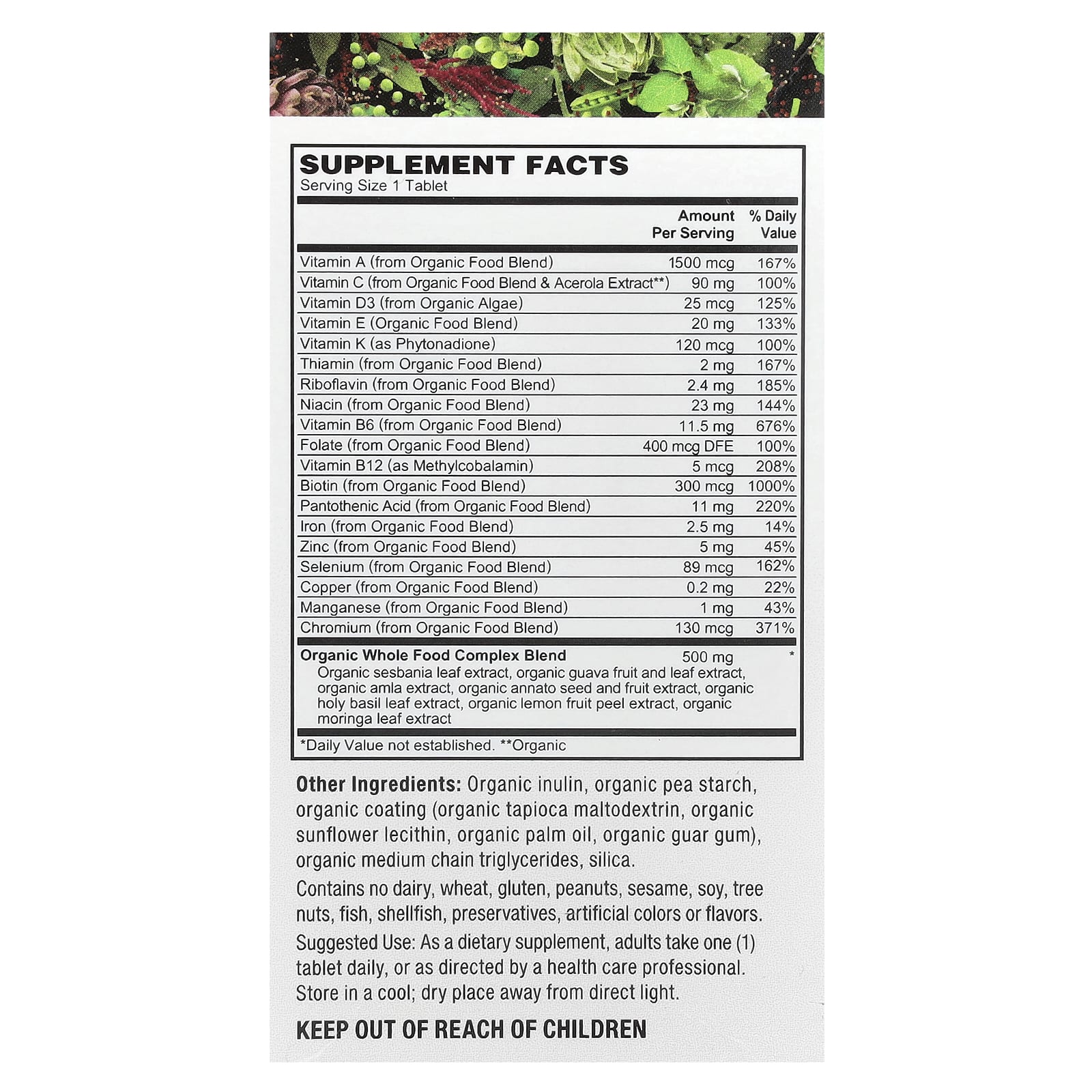 | Витамин А (из смеси органических пищевых продуктов) | 1500 мкг | 167% |