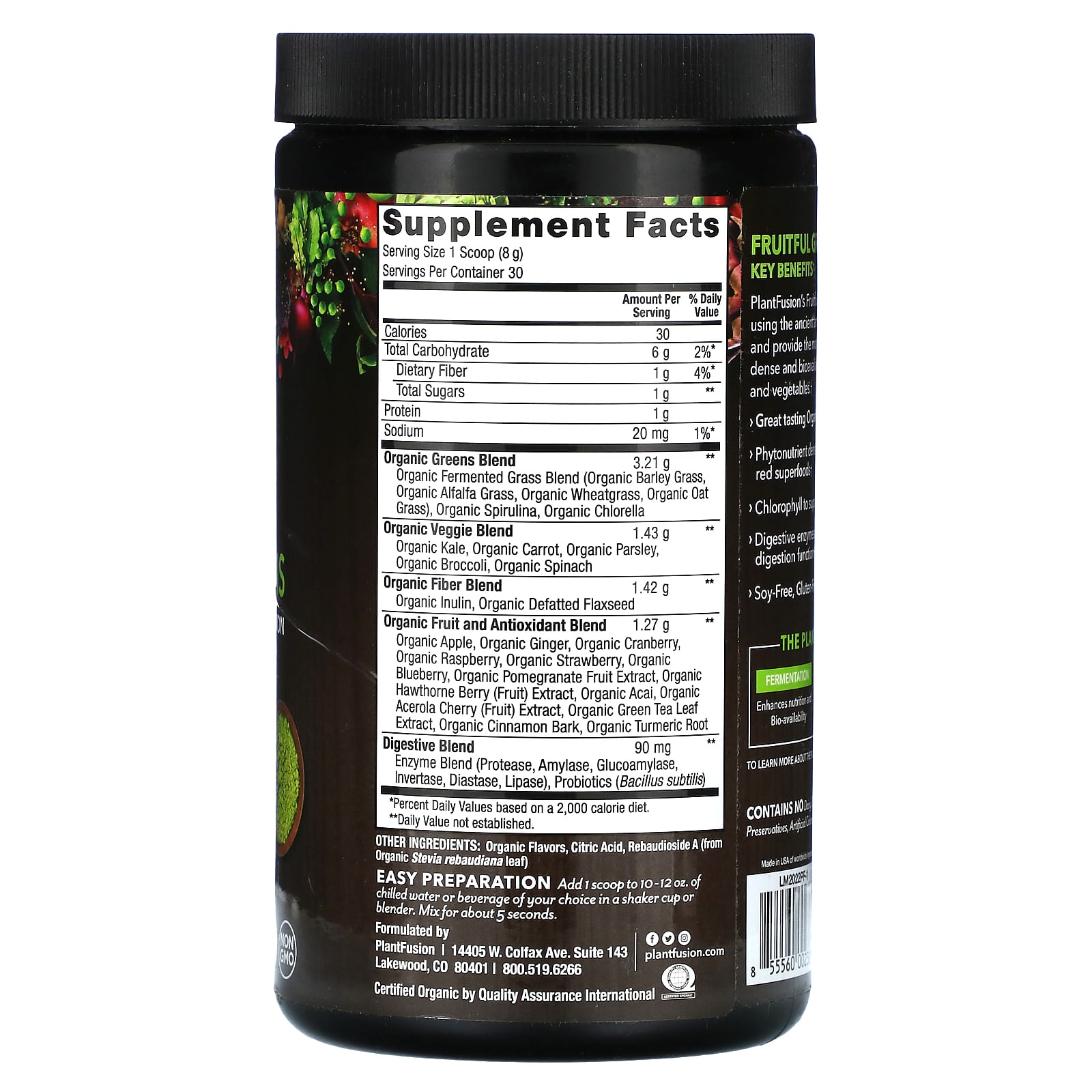 Fruitful Greens от PlantFusion был разработан с использованием древнего искусства ферментации для создания и обеспечения наиболее легкоусвояемой, богатой фитонутриентами и биодоступной формой органической зелени, фруктов и овощей.