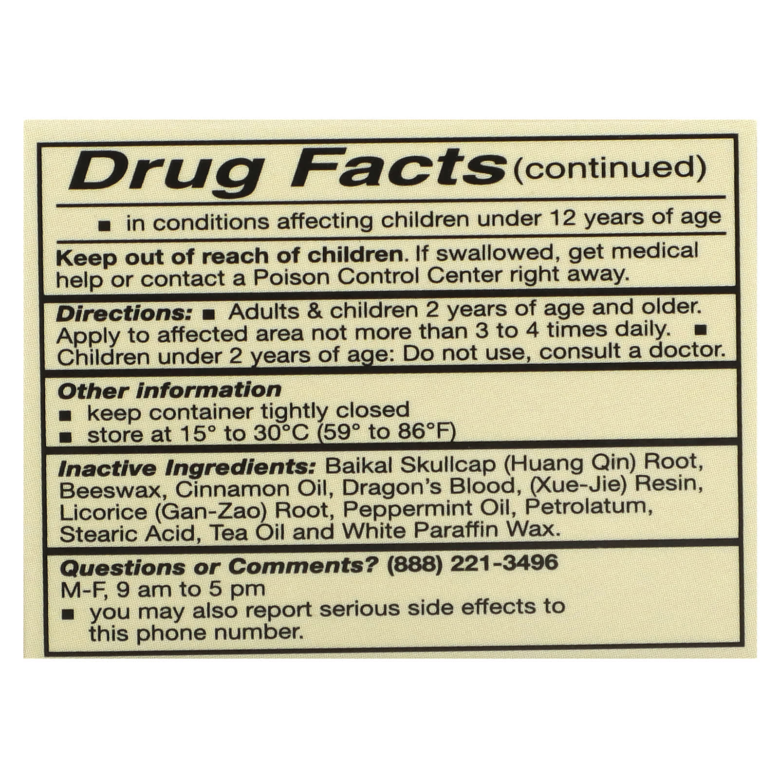 | корень шлемника байкальского (huang qin), пчелиный воск, масло корицы, кровь питахайи, смола сюэ-джи, корень солодки (ган-цзао), масло перечной мяты, вазелин, стеариновая кислота, масло чая и белый парафиновый воск. | |