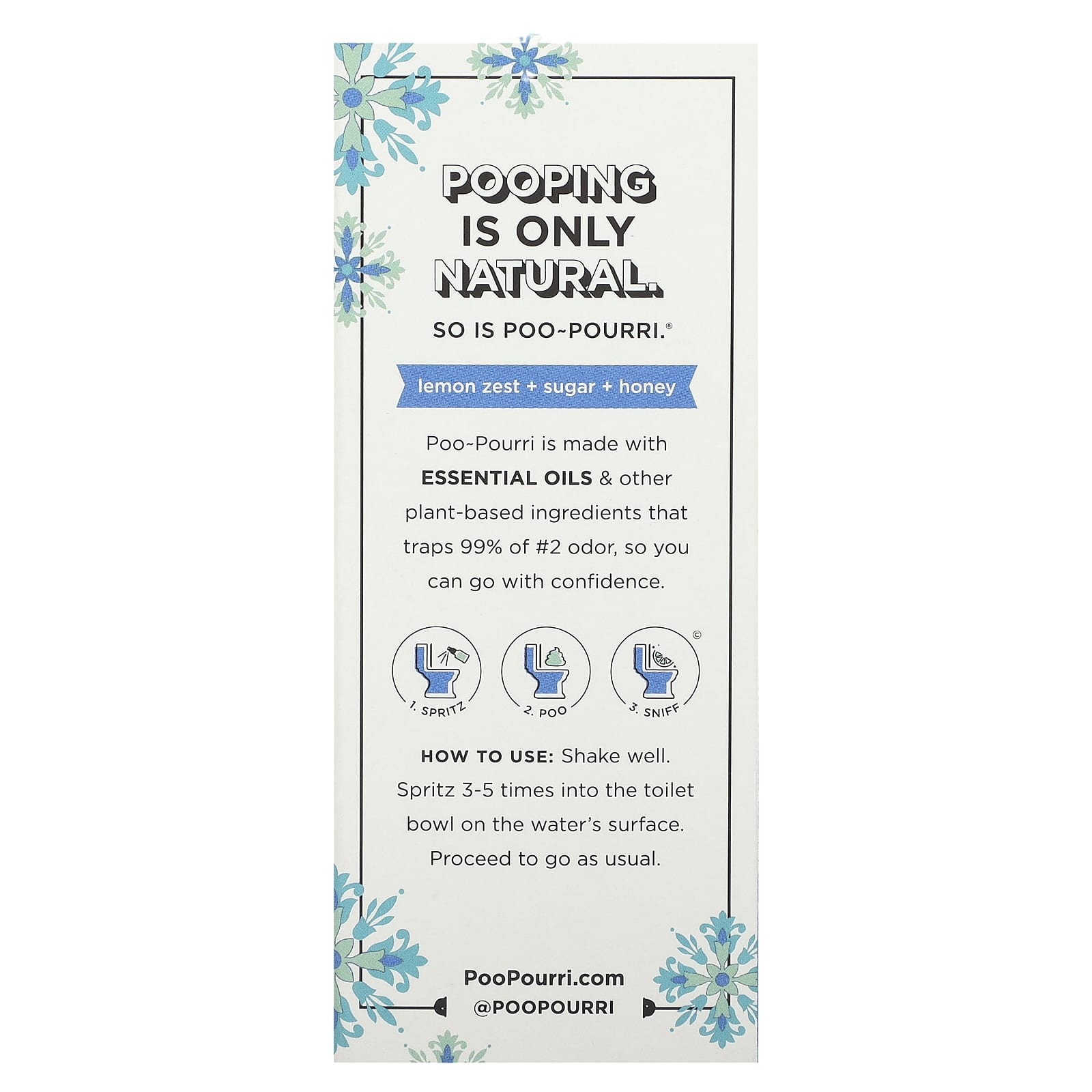 Средство Poo~Pourri изготовлено из эфирных масел и других растительных ингредиентов, которое улавливает до 99% запаха № 2, поэтому вы можете быть уверены в своем выборе.