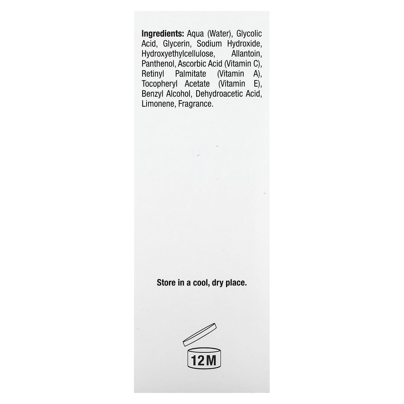 Вода (Aqua), гликолевая кислота, глицерин, гидроксид натрия, гидроксиэтилцеллюлоза, аллантоин, пантенол, аскорбиновая кислота (витамин C), ретинилпальмитат (витамин A), токоферилацетат (витамин Е), бензиловый спирт, дегидроуксусная кислота, лимонен, отдушка.