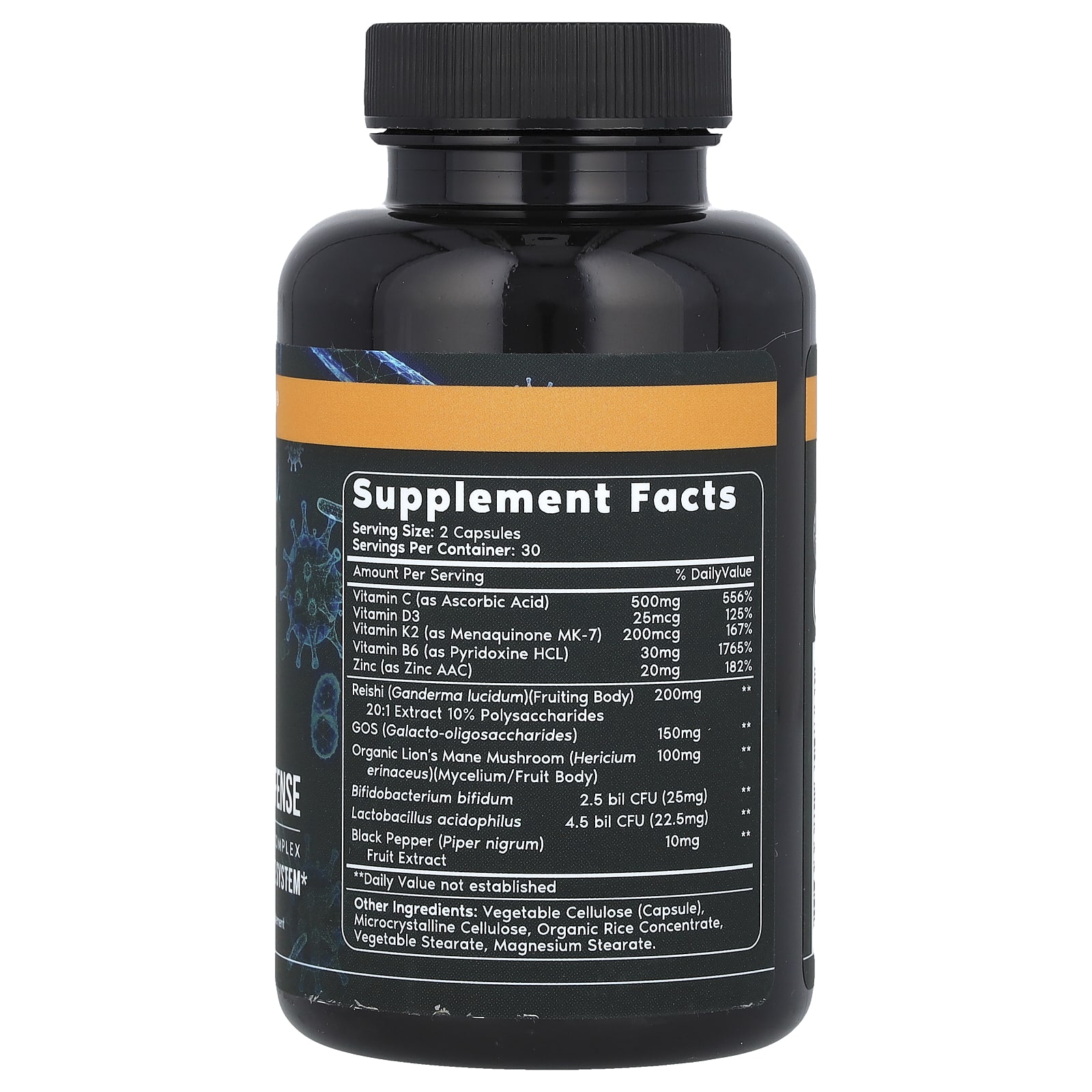 | Витамин C (в виде аскорбиновой кислоты) Витамин D3 Витамин K2 (в виде менахинона МК-7) Витамин B6 (в виде пиридоксина гидрохлорида) Цинк (в виде цинка AAC) | 500 мг 25 мкг 200 мкг 30 мг 20 мг | 556% 125% 167% 1765% 182% |