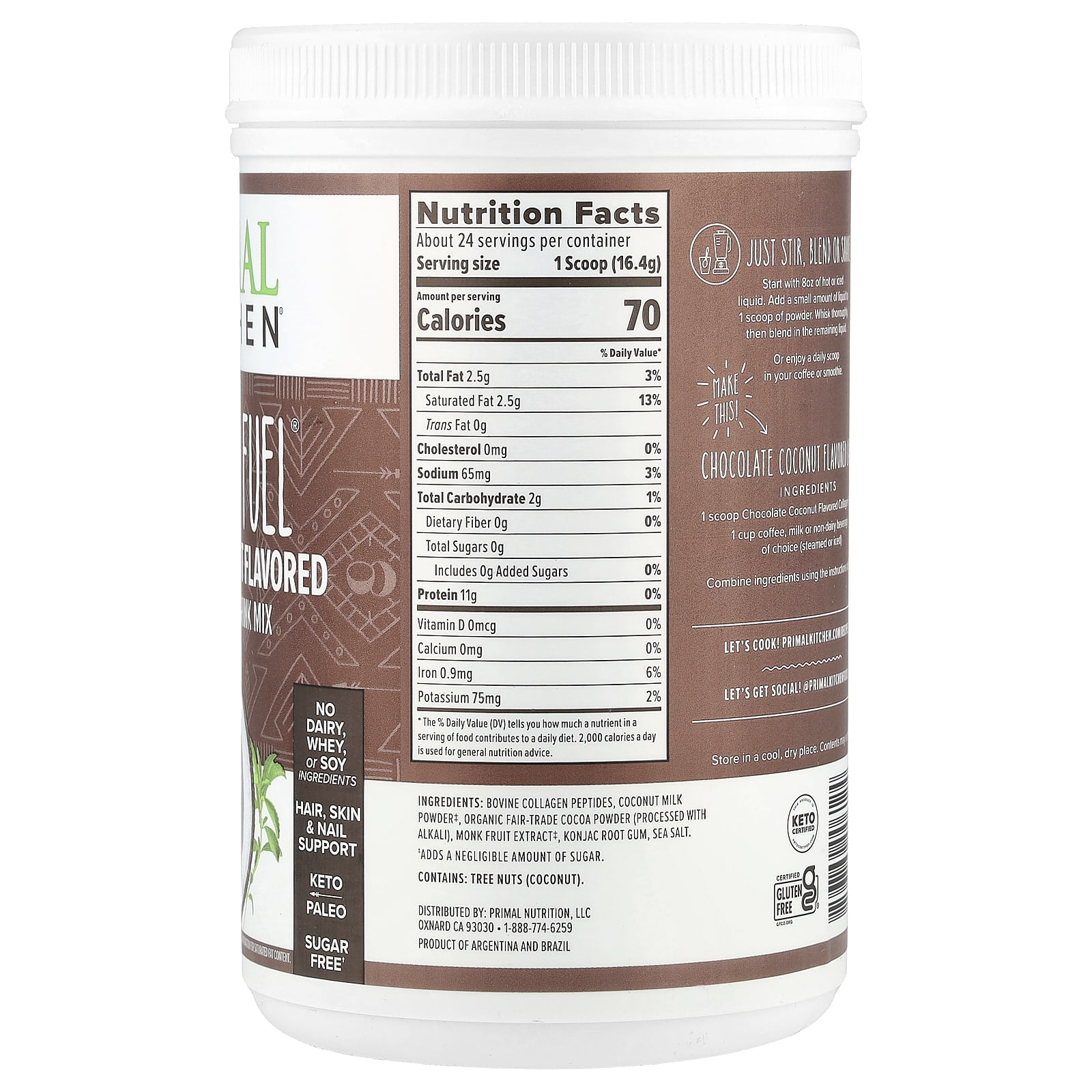 Пептиды бычьего коллагена, порошок из кокосового молока‡, органический какао-порошок (обработанный щелочью), экстракт архата, камедь корня конжака, морская соль.