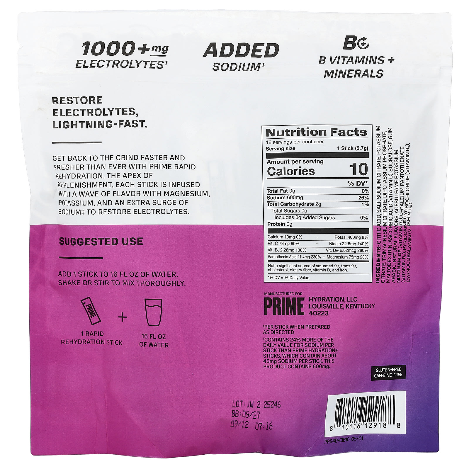 ‡ Содержит на 24% больше суточной нормы натрия в одном стике, чем стики Prime Hydration+, которые содержат около 45 мг натрия. Этот продукт содержит 600 мг