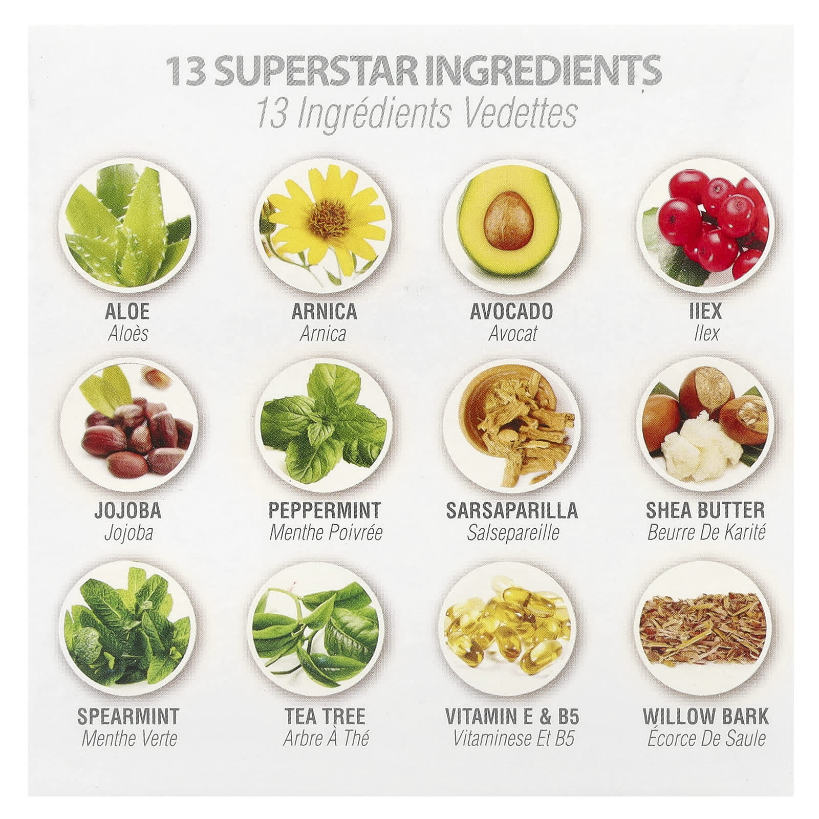 Очищенная вода, хлорид стеаралкония, глицерин (растительного происхождения), экстракт сарсапариллы, экстракт листьев падуба парагвайского (Ilex paraguariensis), пантенол (провитамин B5), цетиловый спирт, диэтилгексил себацинат, цетеариловый спирт, полисорбат 60, масло ши (Butyrospermum parkii), экстракт цветков арники (Arnica montana), экстракт коры ивы (Salix nigra), масло из листьев чайного дерева (Melaleuca alternifolia), масло авокадо (Persea gratissima), экстракт листьев алоэ вера (Aloe barbadensis), масло семян жожоба (Simmondsia chinensis), масло листьев мяты колосистой (Mentha viridis), масло перечной мяты (Mentha piperita), токоферил (витамин Е) ацетат, циклометикон, феноксиэтанол, каприлилгликоль, сорбиновая кислота