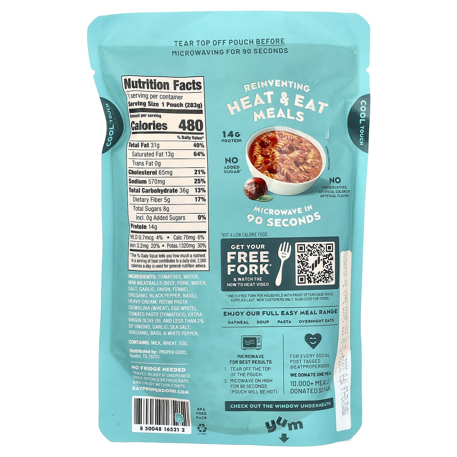 Томаты, вода, мини-фрикадельки (говядина, свинина, вода, соль, чеснок, лук, фенхель, орегано, черный перец, базилик), жирные сливки, паста rotini (манка (пшеница), яичный белок), томатная паста (томаты), оливкового масла холодного отжима и менее 2% лука, чеснок, морская соль, орегано, базилик белый перец.