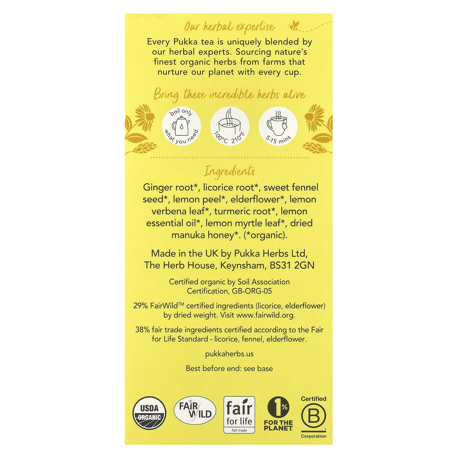 Корень имбиря*, корень солодки*, семена сладкого фенхеля*, цедра лимона*, бузина*, листья лимонной вербены*, корень куркумы*, эфирное масло лимона*, листья лимонного мирта*, сушеный мед манука*. (* органический).