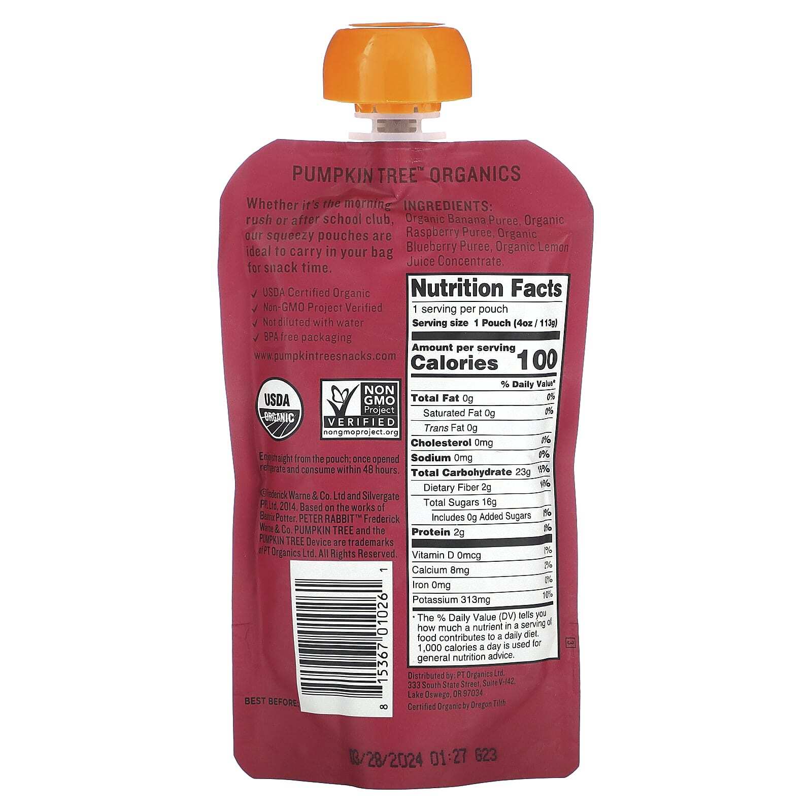 Pumpkin Tree Organics, Peter Rabbit Organics, органическое фруктовое пюре, банан, малина и голубика, 113 г (4 унции)