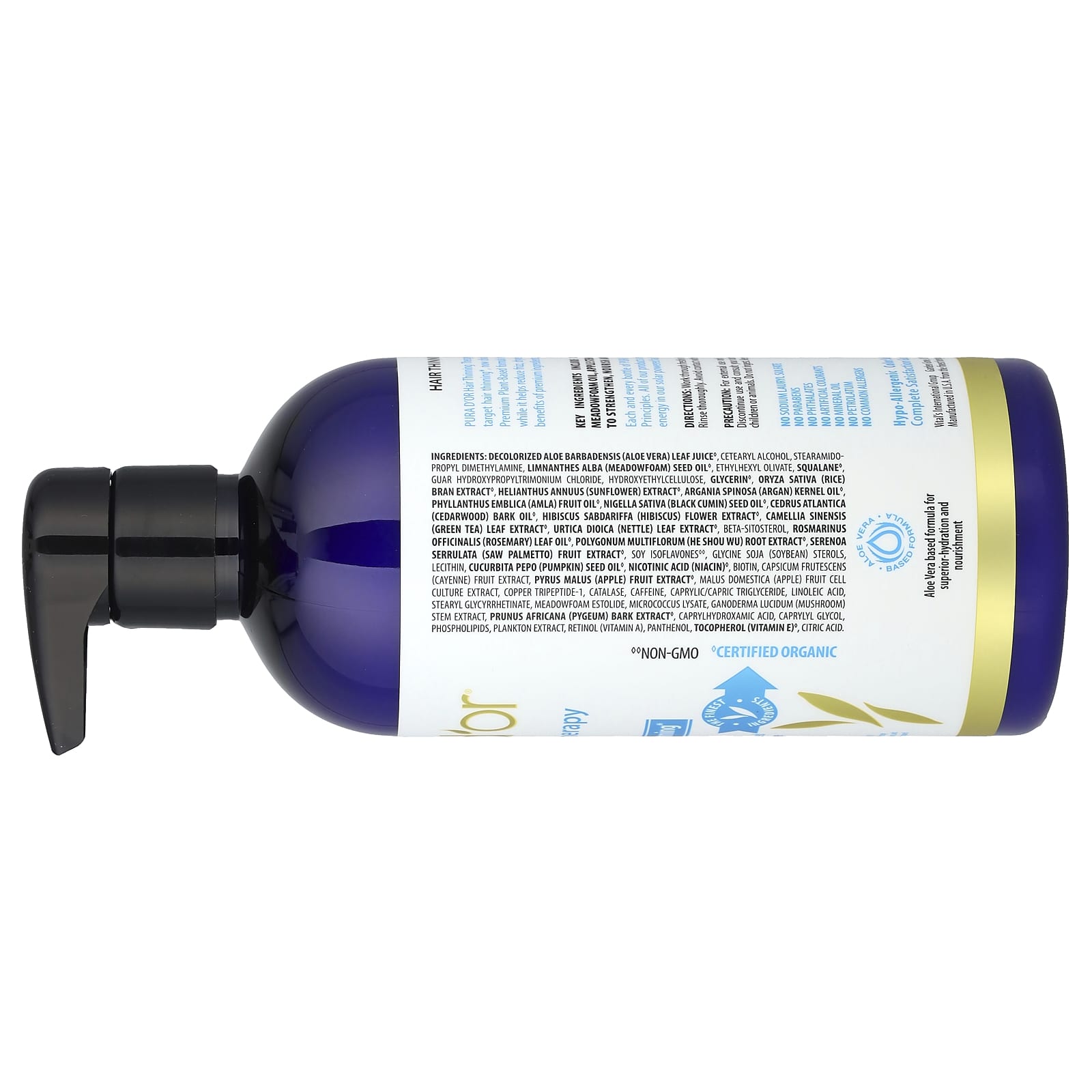 Обесцвеченный сок из листьев алоэ вера (Aloe barbadensis)º, цетеариловый спирт, стеарамидопропил диметиламин, масло из семян пенника лугового (Limnanthes alba)º, этилгексил оливат, скваланº, гуар гидроксипропилтримония хлорид, гидроксиэтилцеллюлоза, глицеринº, экстракт рисовых отрубей (Oryza sativa)º, экстракт подсолнечника (Helianthus annuus)º, аргановое масло (Argania spinosa), масло из плодов амлы (Phyllanthus emblica)º, масло из семян чёрного тмина (Nigella sativa)º, масло коры кедра атласского (Cedrus atlantica), экстракт цветков гибискуса (Hibiscus sabdariffa)º, экстракт листьев зелёного чая (Camellia sinensis)º, экстракт листьев крапивы двудомной (Urtica dioica), бета-ситостерол, масло из листьев розмарина (Rosmarinus officinalis)º, экстракт корня горца многоцветкового (Polygonum multiflorum)º, экстракт плодов серенои (Serenoa serrulata)º, изофлавоны соиºº, стеролы сои (Glycine soja), лецитин, масло из семян тыквы (Cucurbita pepo)º, никотиновая кислота (ниацин)º, биотин, экстракт плодов кайенского перца (Capsicum frutescens), экстракт яблока (Pyrus malus)º, экстракт культуры клеток плодов яблони домашней (Malus domestica), меди трипептид-1, каталаза, кофеин, каприловый/каприновый триглицерид, линолевая кислота, стеарил глицирретинат, эстолид пенника лугового, лизат микрококка, экстракт стеблей рейши (Ganoderma lucidum), экстракт коры сливы африканской (Pygeum)º, каприлгидроксаминовая кислота, каприлилгликоль, фосфолипиды, экстракт планктона, ретинол (витамин A), пантенол, токоферол (витамин E)º, лимонная кислота.