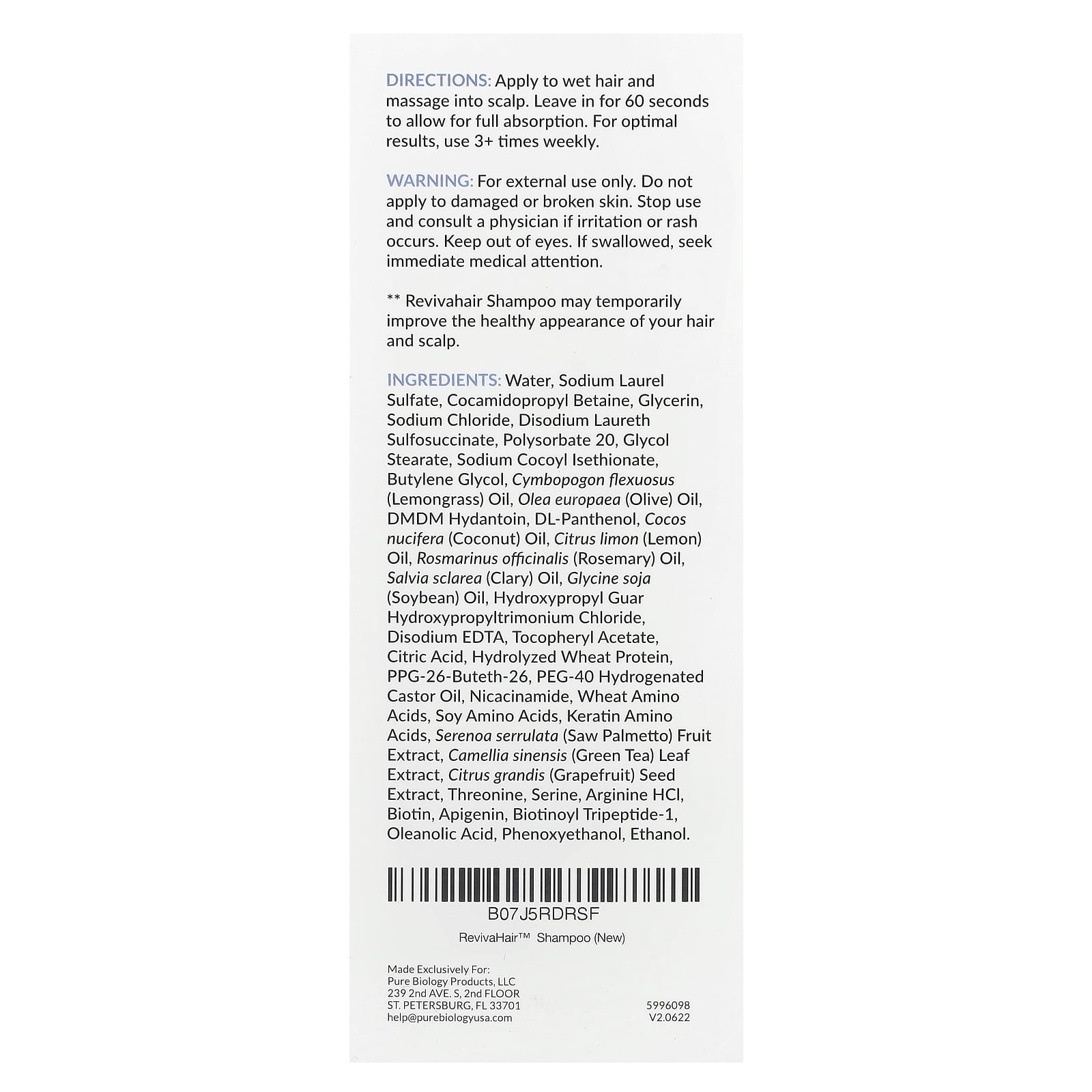 Вода, лаурилсульфат натрия, динатрий лаурет сульфосукцинат, кокамидопропил бетаин, гидроксипропилгуар гидроксипропилтримоний, пантенол, соевое масло (глицин), кокосовое масло (Cocos nucifera), масло лимона (Citrus limon), масло розмарина (Rosmarinus officinalis), масло шалфея (Salvia sclarea), экстракт плодов серенои серрулата (Serenoa serrulata), экстракт листьев зеленого чая (Camellia sinensis), глицерин, моностеарат этиленгликоля, полисорбат 20, бутиленгликоль, ППГ-26-бутет-26, ПЭГ-40 гидрогенизированное касторовое масло, апигенин, олеаноловая кислота, биотиноил трипептид-1, хлорид натрия, оливковое масло (Olea europaea), масло лемонграсса (Cymbopogon flexuosus), дмдм гидантоин, экстракт косточек грейпфрута (Citrus grandis), аминокислоты пшеницы, двунатриевая эдта, токоферилацетат, лимонная кислота, никотинамид, кератин аминокислоты, d-биотин.