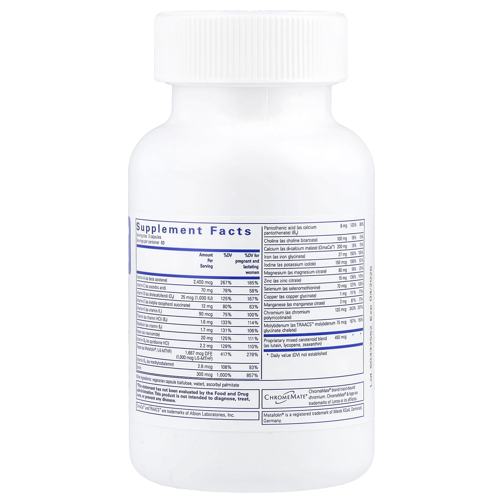 Этот витамин для беременных содержит 1 мг фолиевой кислоты в виде фолиевой кислоты и метафолин 5-MTHF, естественную, универсально метаболизируемую форму фолата для здорового нервного и клеточного развития головного и спинного мозга плода. Наша формула для беременных также содержит 100 мг холина для поддержки развития центральной нервной системы плода.