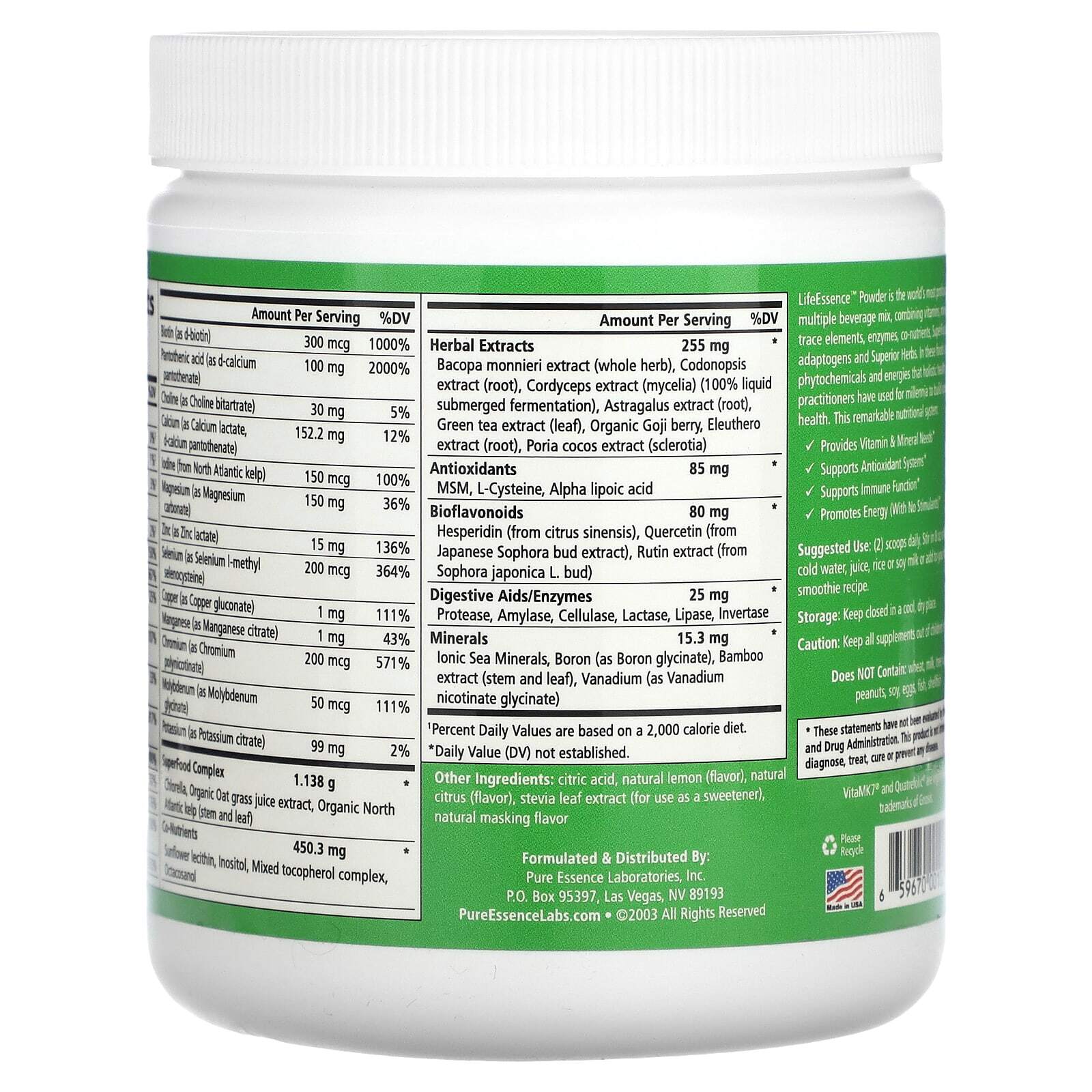 LifeEssence Powder — это удобный, заряжающий энергией и вкусный витаминный, минеральный и фитохимический порошок, содержащий 1,138 г смеси хлореллы, экстракта сока из органической овсяной травы и североатлантической бурой водоросли, 255 мг экстрактов лекарственных трав превосходного качества, 80 мг биофлавоноидов, и 450 мг смеси таких питательных веществ, как лецитин подсолнечника, инозитол, смешанные токоферолы и октакозанол. Эти дополнительные факторы делают порошок LifeEssence не просто универсальным, но и очень полезным источником питания. LifeEssence гарантированно удовлетворит ваши потребности.