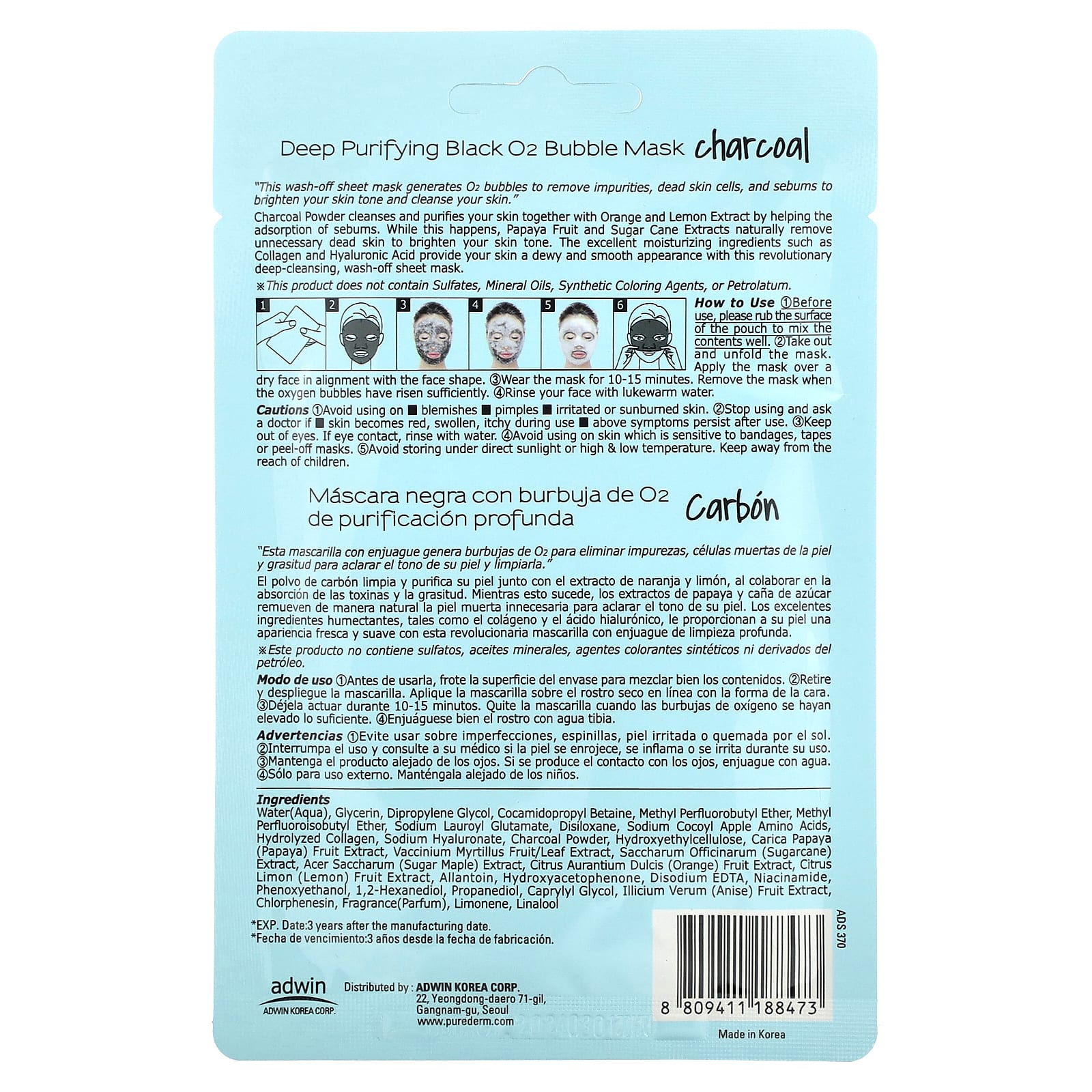 «Эта смываемая тканевая маска генерирует пузырьки O2, удаляя загрязнения, омертвевшие клетки кожи и кожный жир, улучшая тон и очищая кожу».