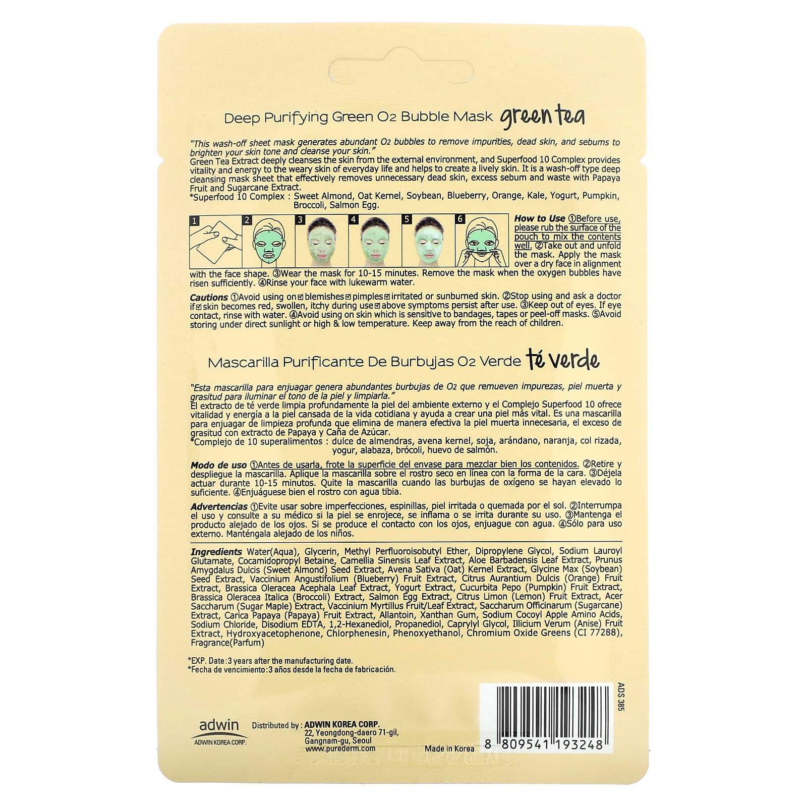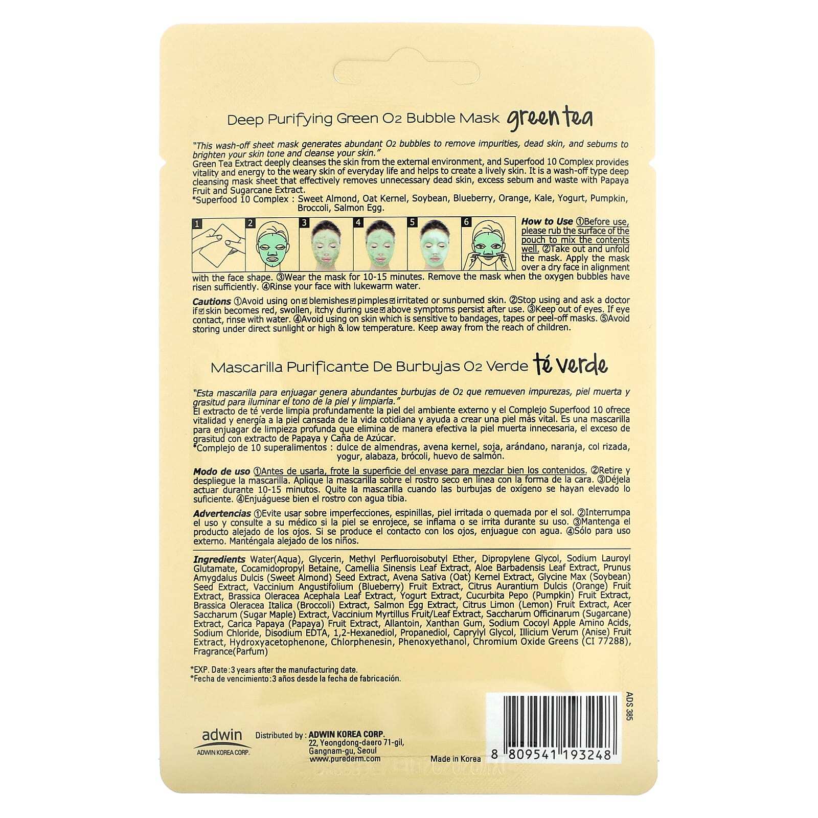 «Эта смываемая тканевая маска генерирует обильные пузырьки O2, удаляя загрязнения, омертвевшие участки кожи и кожный жир, улучшая тон и очищая кожу».