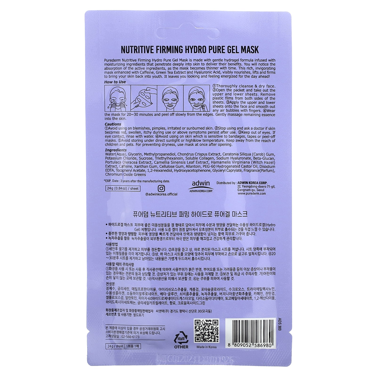 Укрепляющая гидрогелевая маска Purederm Nutritive создана на основе нежной гидрогелевой формулы, содержащей увлажняющие ингредиенты, которые глубоко проникают в кожу, обеспечивая свои преимущества. Вы заметите впитывание активных ингредиентов, поскольку со временем маска становится тоньше. Эта насыщенная бодрящая маска с кофеином, экстрактом зеленого чая и гиалуроновой кислотой заметно питает, подтягивает и укрепляет кожу, возвращая ей молодость. Вы будете выглядеть и чувствовать себя заряженными на предстоящий день!