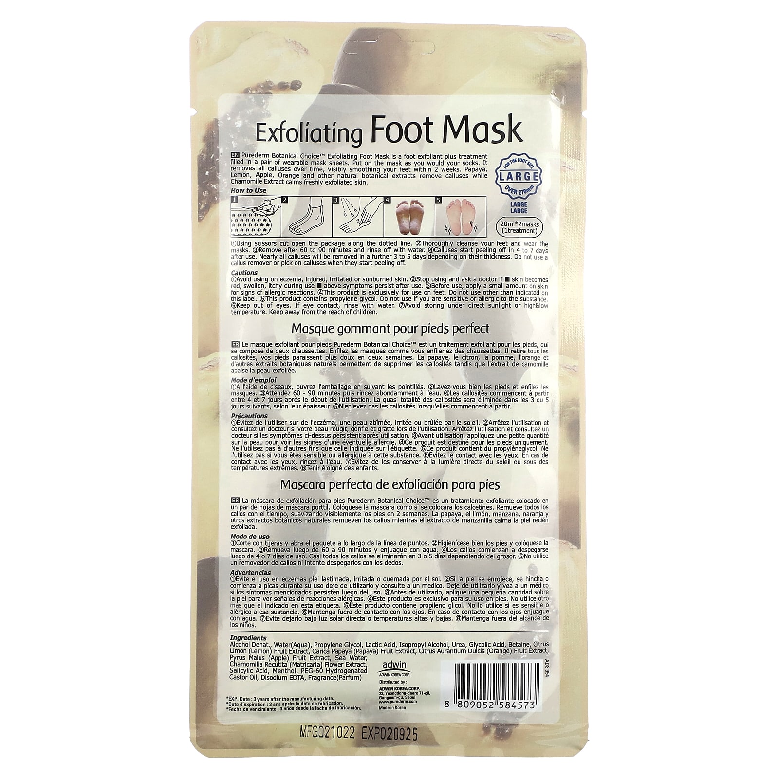 Отшелушивающая маска для ног Purederm Botanical Choice ™ - это отшелушивающее средство для ног в комплекте с парой носимых маскировочных полотен. Наденьте маску, как носки. Со временем он удаляет все мозоли, заметно разглаживая кожу ног в течение 2 недель. Экстракт папайи, лимона, яблока, апельсина и другие натуральные растительные экстракты удаляют мозоли, а экстракт ромашки успокаивает только что отшелушенную кожу.