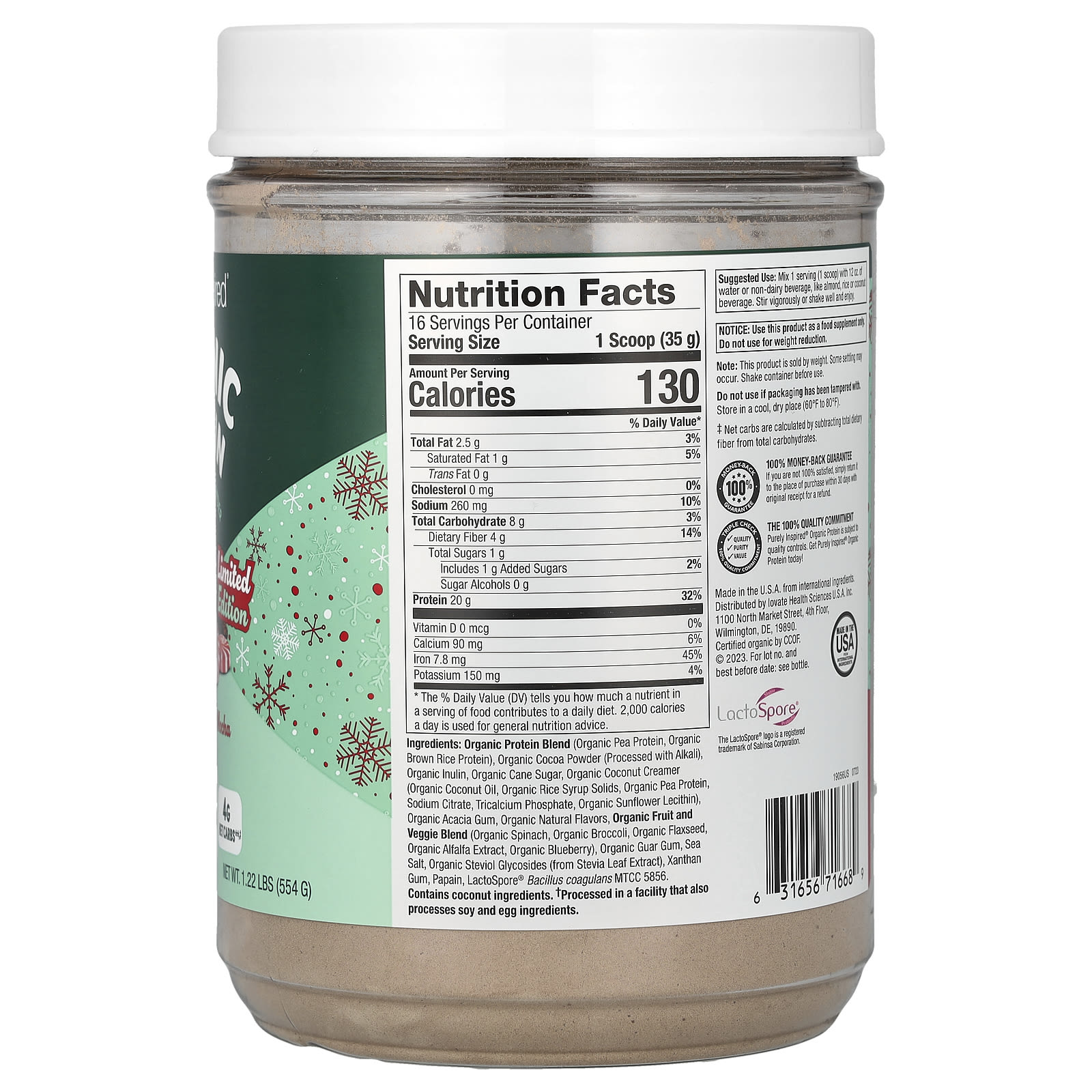 Органическая протеиновая смесь (органический гороховый протеин, органический протеин из бурого риса), органический какао-порошок (обработанный щелочью), органического инулина, органический тростниковый сахар, органические кокосовые сливки (органическое кокосовое масло, сухие вещества органического рисового сиропа, органический гороховый протеин, цитрат натрия, трикальций фосфат, органический подсолнечный лецитин), органическая аравийская камедь, органические натуральные ароматизаторы, смесь органических фруктов и овощей (органический шпинат, органическая брокколи, органическое льняное семя, органический экстракт люцерны, органическая голубика), органическая гуаровая камедь, морская соль, органические стевиоловые гликозиды (из экстракта листьев стевии), ксантановая камедь, папаин, Lactospore® (бактерии бациллус коагуланс (Bacillus coagulans) MTCC 5856).